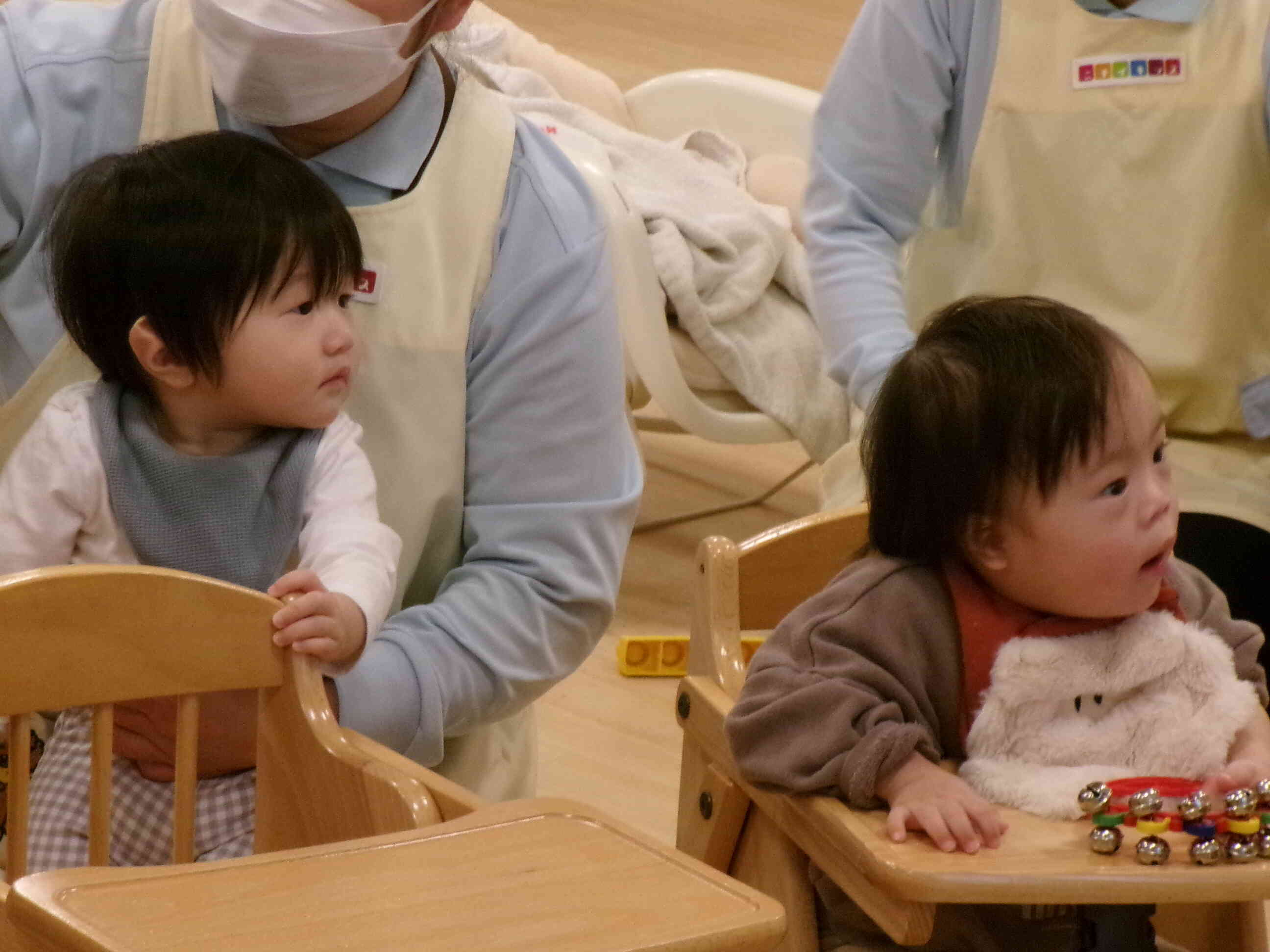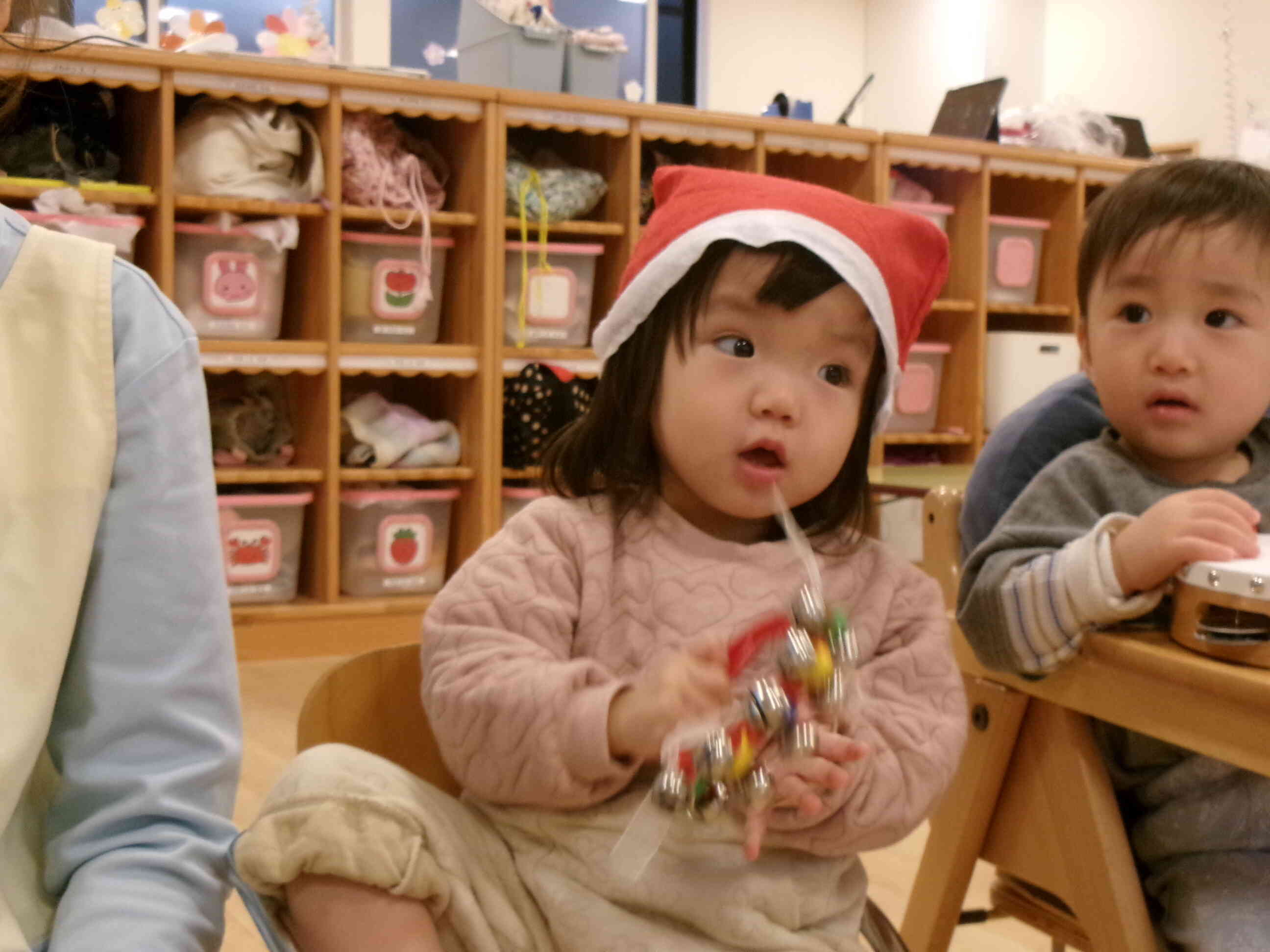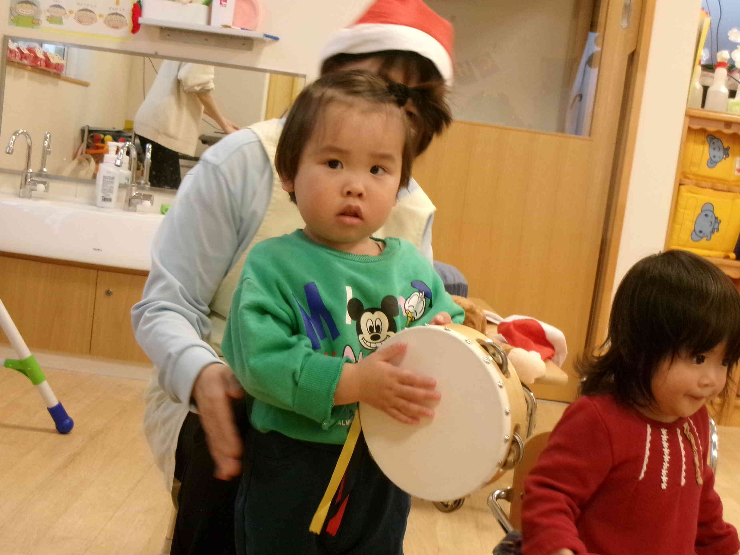 クリスマスソングをみんなで演奏しました。スズやタンバリンの音が、お空のサンタさんに聞こえるように元気に演奏しました。