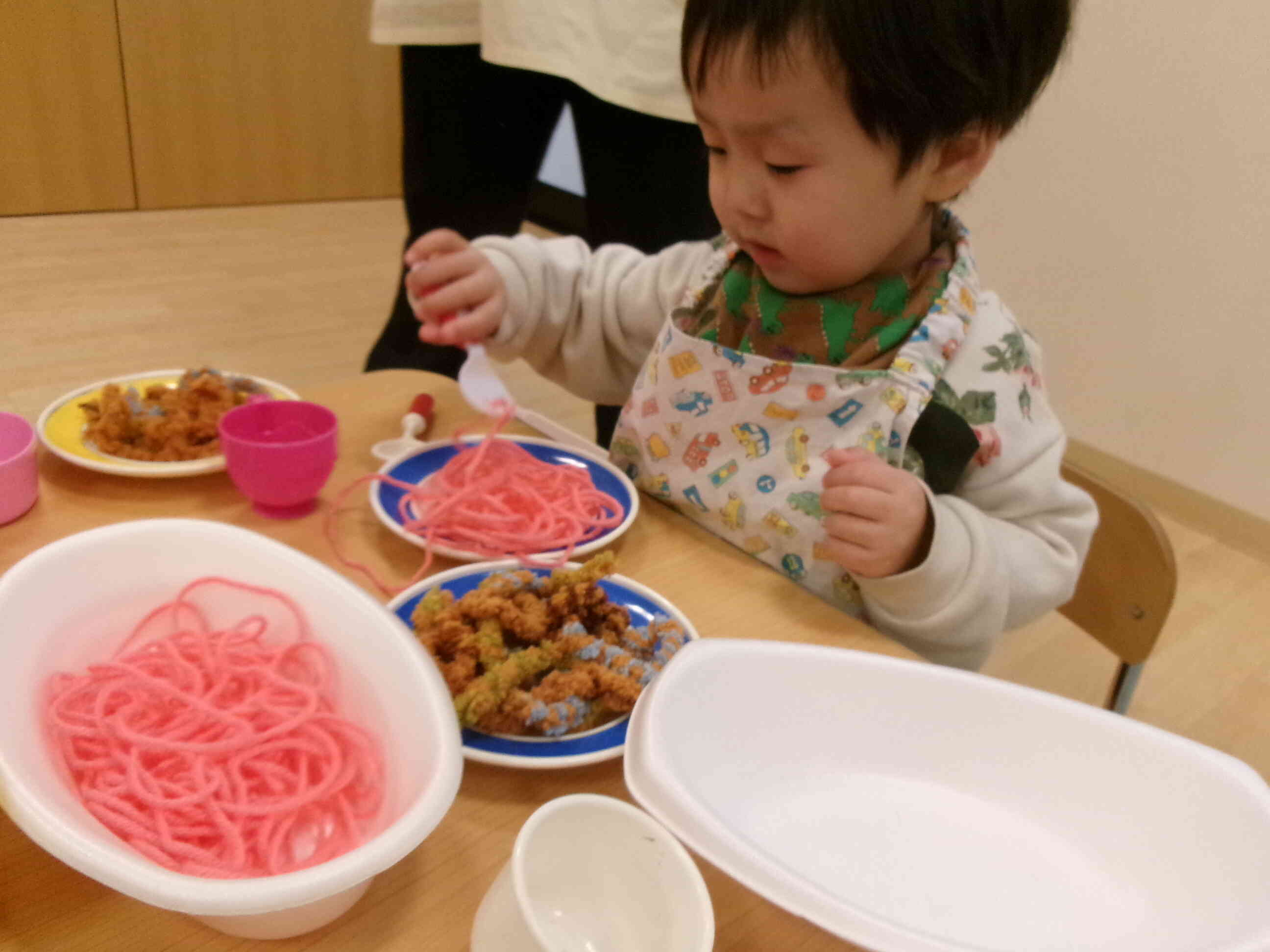 ままごとに、毛糸やカラフルなクッション材を使って紙皿に盛り付けています。
