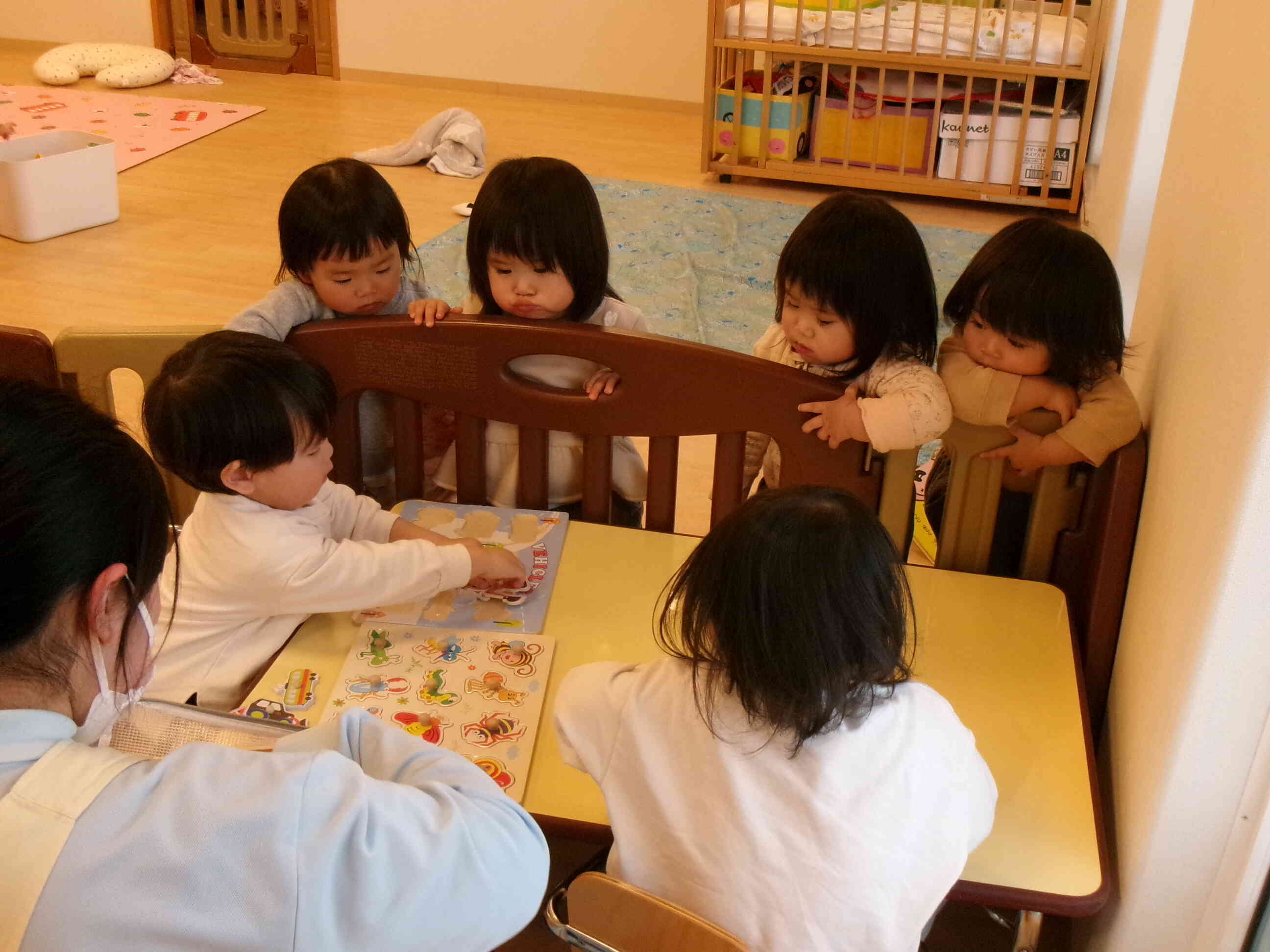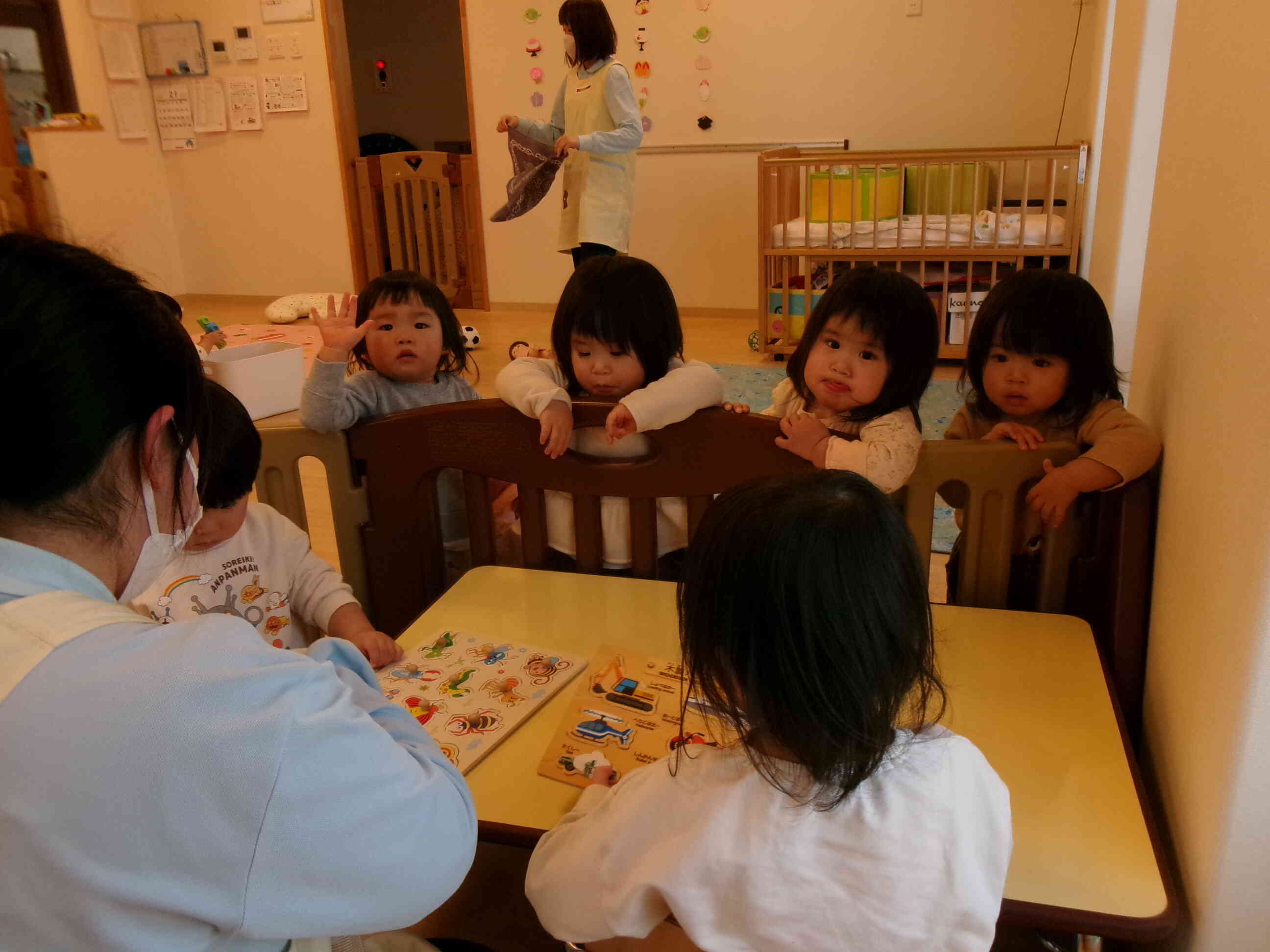 ひよこ組の熱い視線を浴びながら、うさぎ組さんとあひる組さんがパズル遊びをしています。
