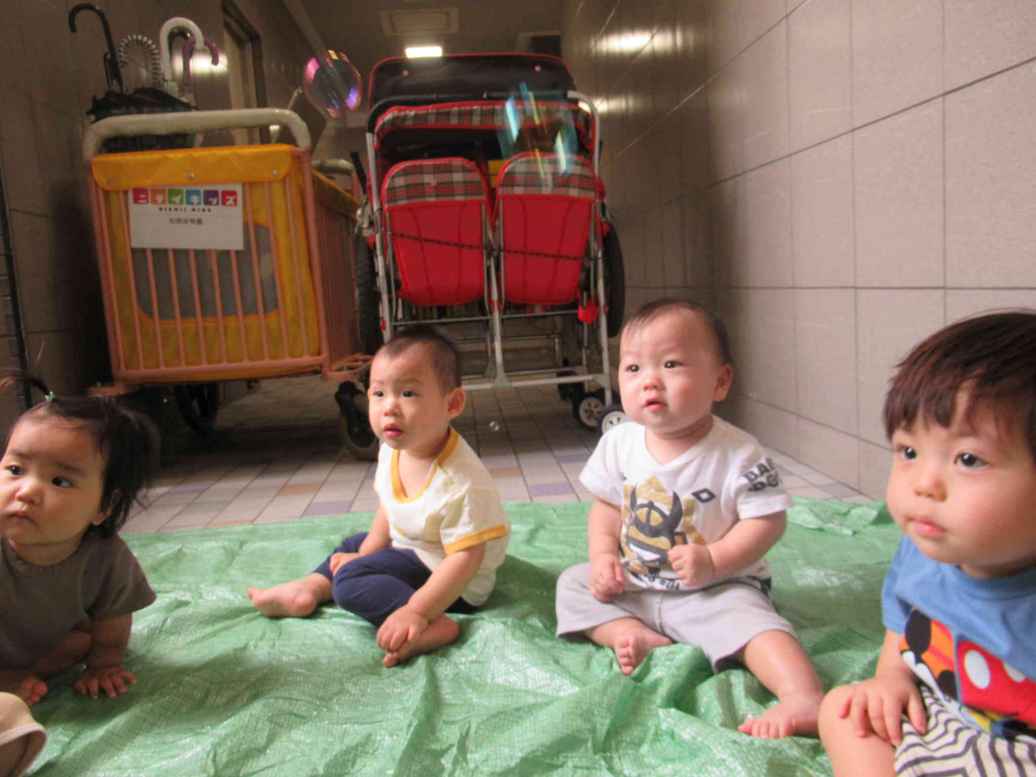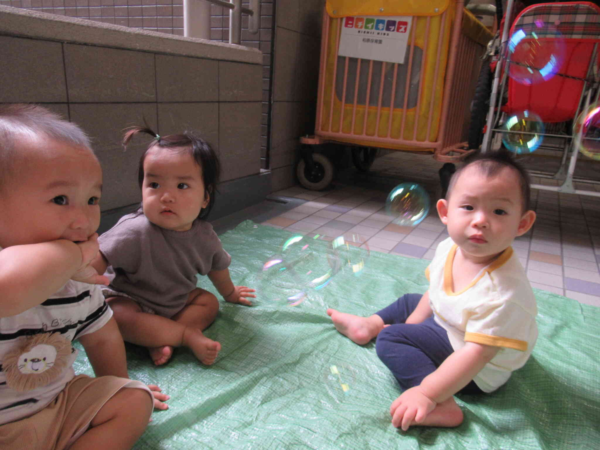 はじめてのしゃぼん玉で最初は少し泣いてしまいましたがすぐに慣れ、手を伸ばしてみたり、先生が「ふ~」としている様子を近くで見てみたりと楽しんでいたひよこ組さんです。