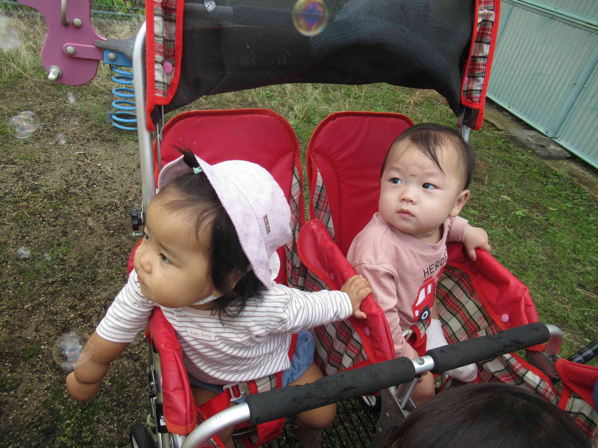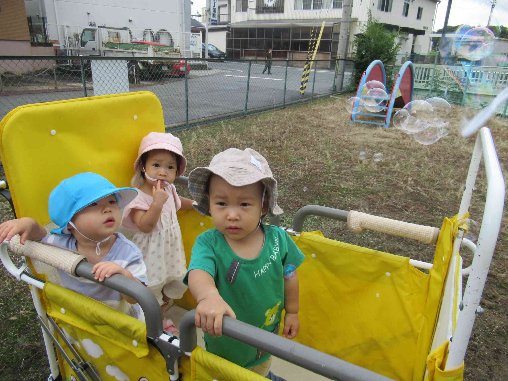 たくさんんのシャボン玉に大喜び。手を伸ばしてみたり、じっと見つめたりととても楽しんでいましたよ♡