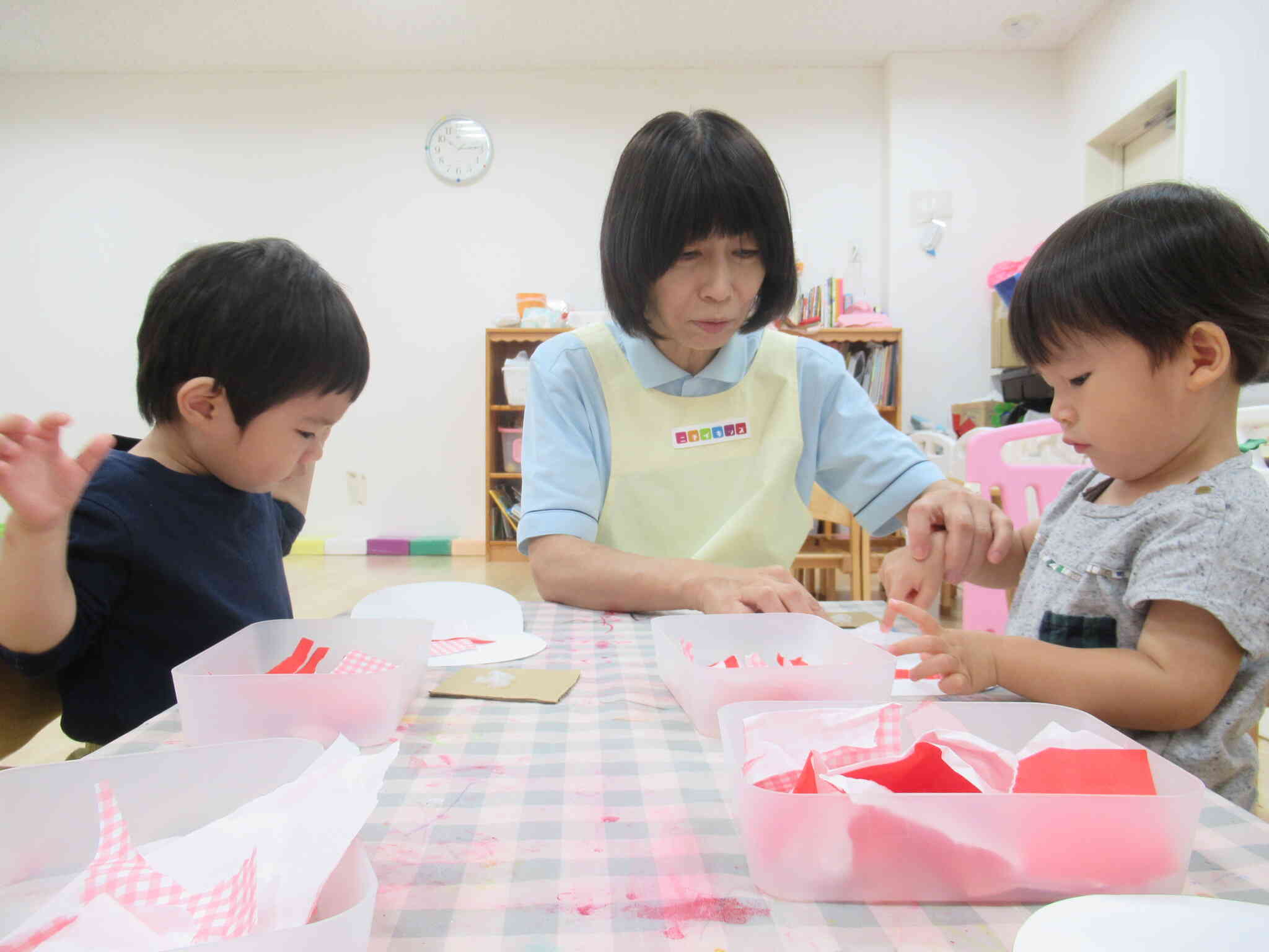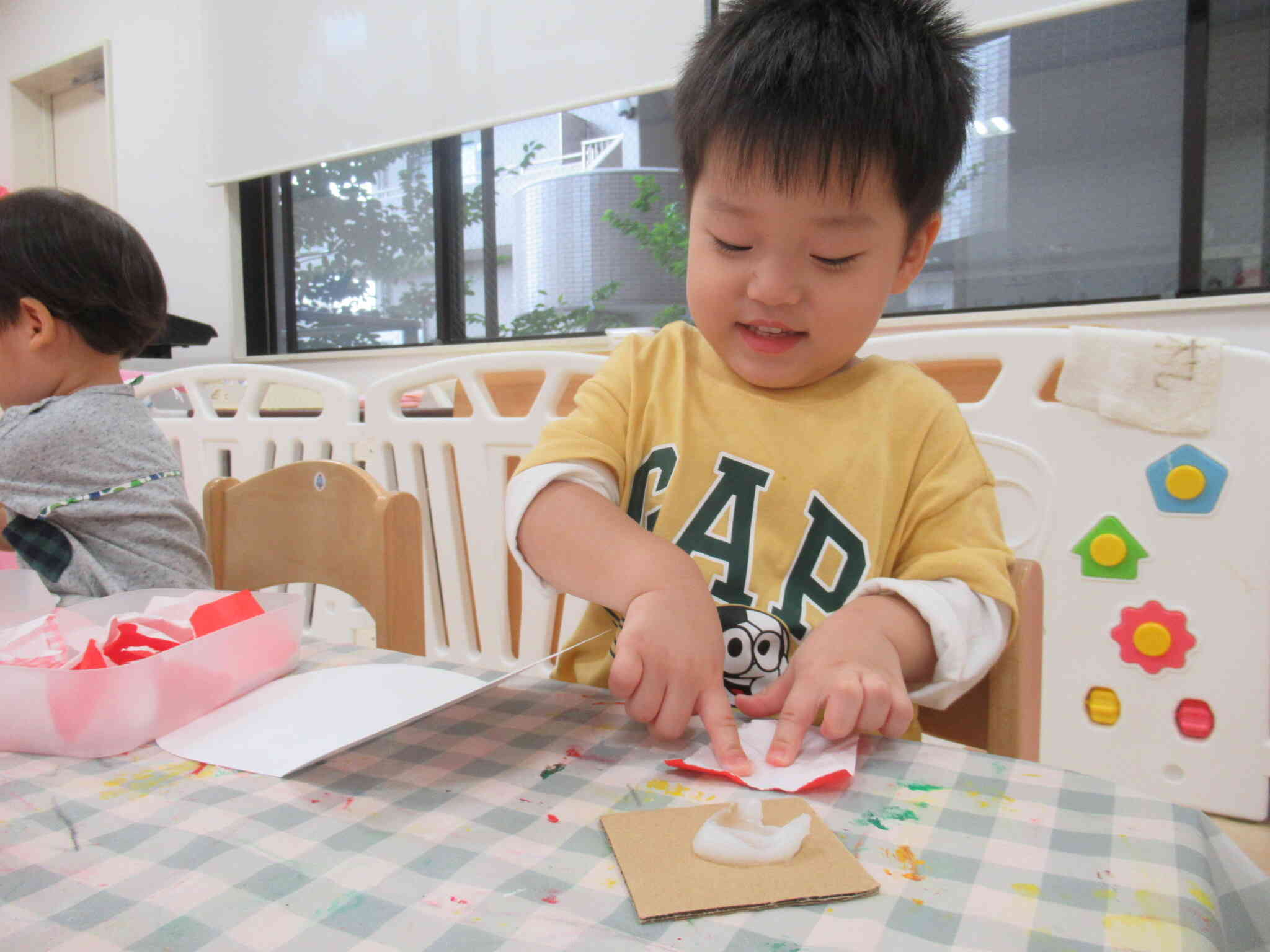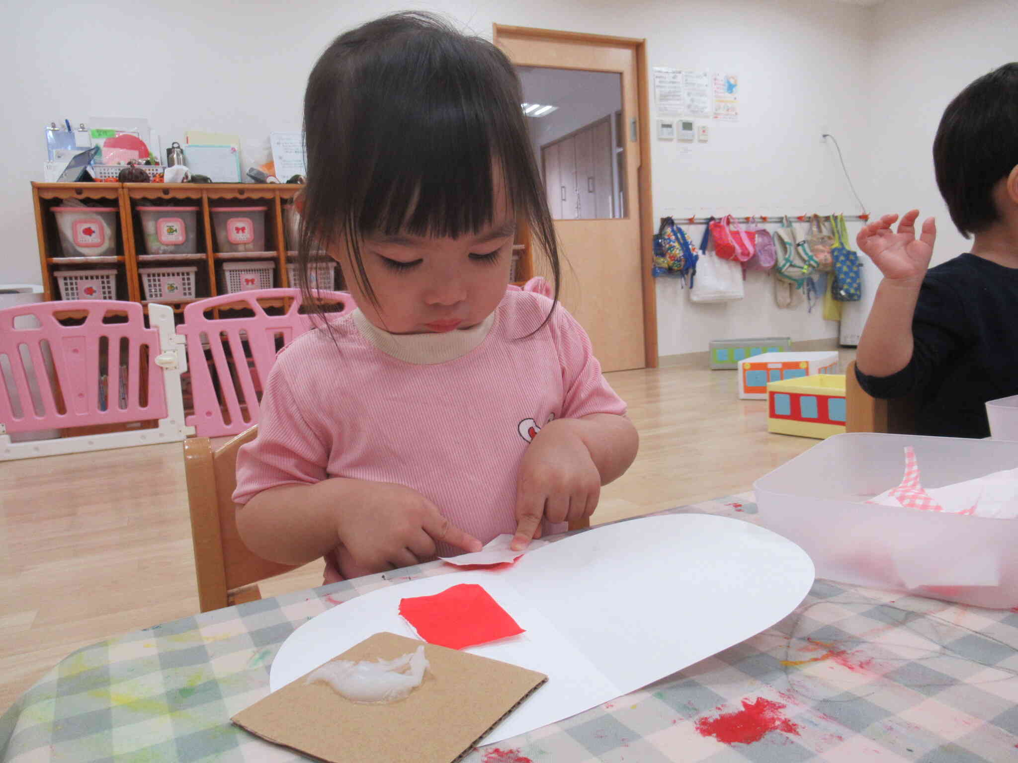 人差し指にしっかり糊をつけて「ぬりぬり♪」と言いながら糊の感触を楽しみながら製作していた子ども達です^ ^