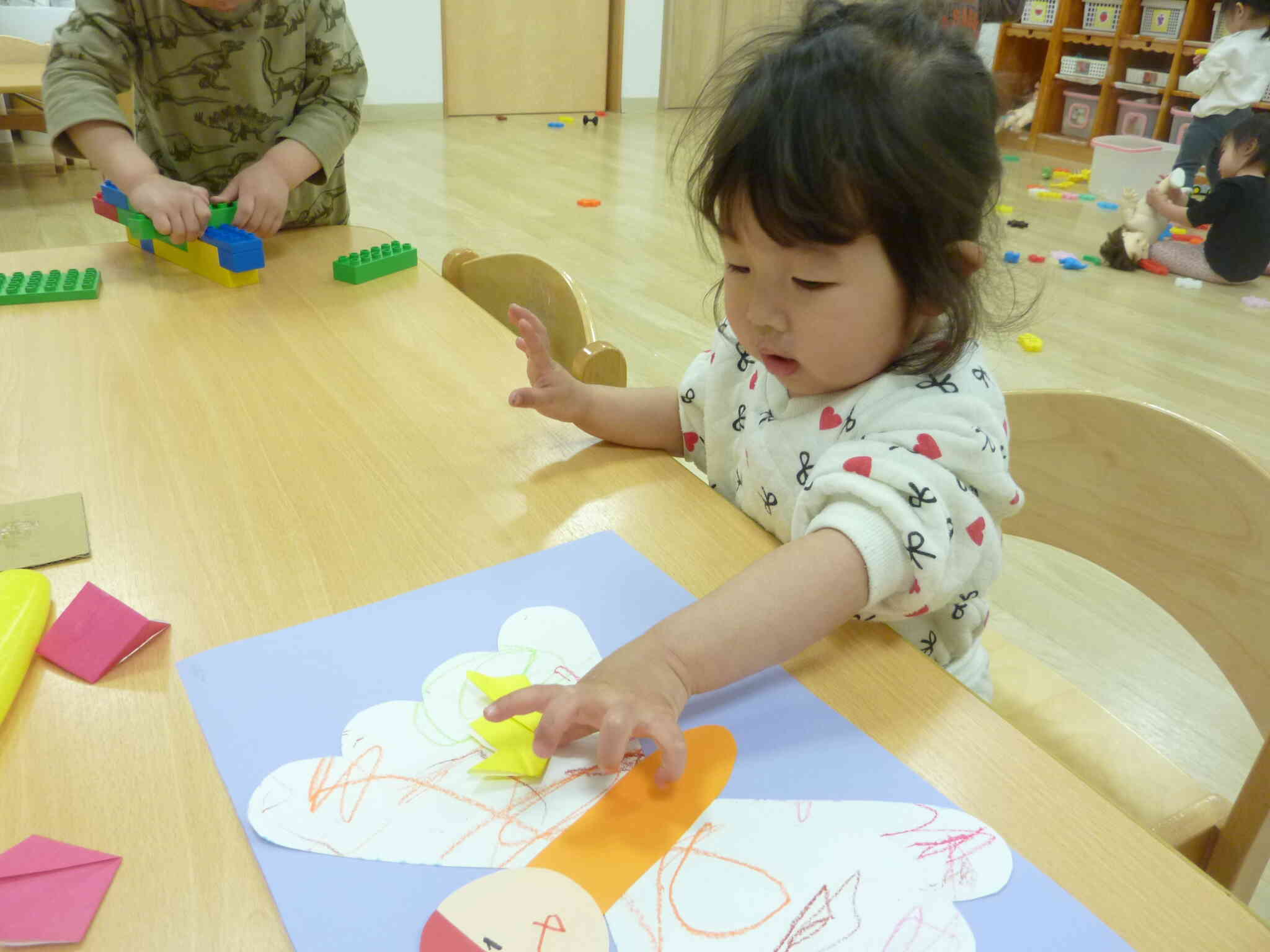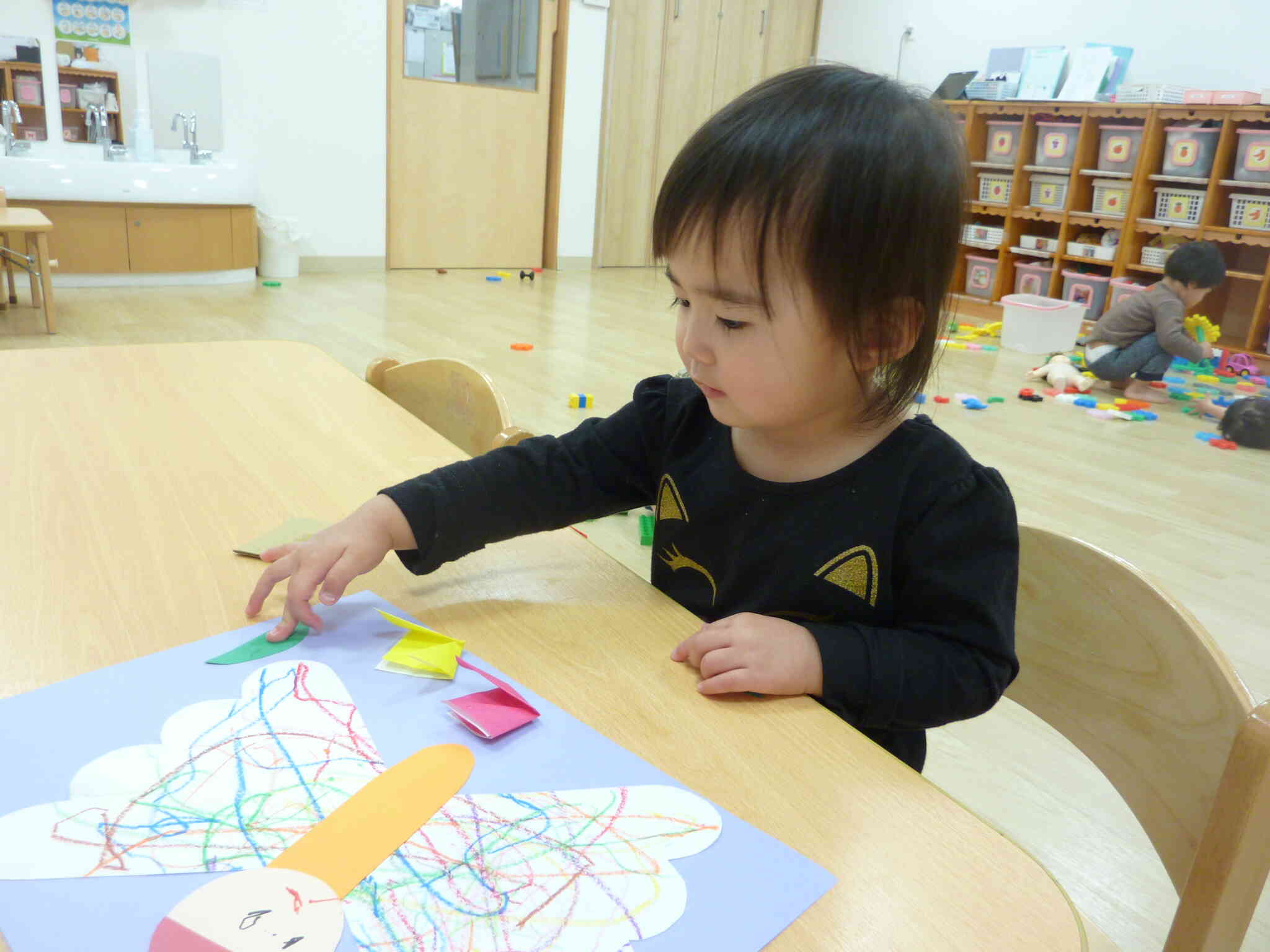 蝶々のお顔をペンで描いたり、初めての折り紙にも挑戦してチューリップが出来ました。