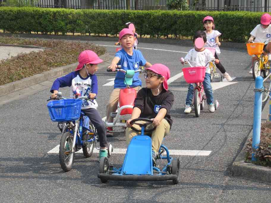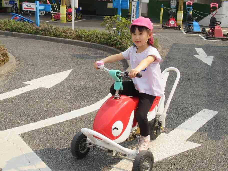 交通公園には信号や踏切があり、交通ルールに従って運転します