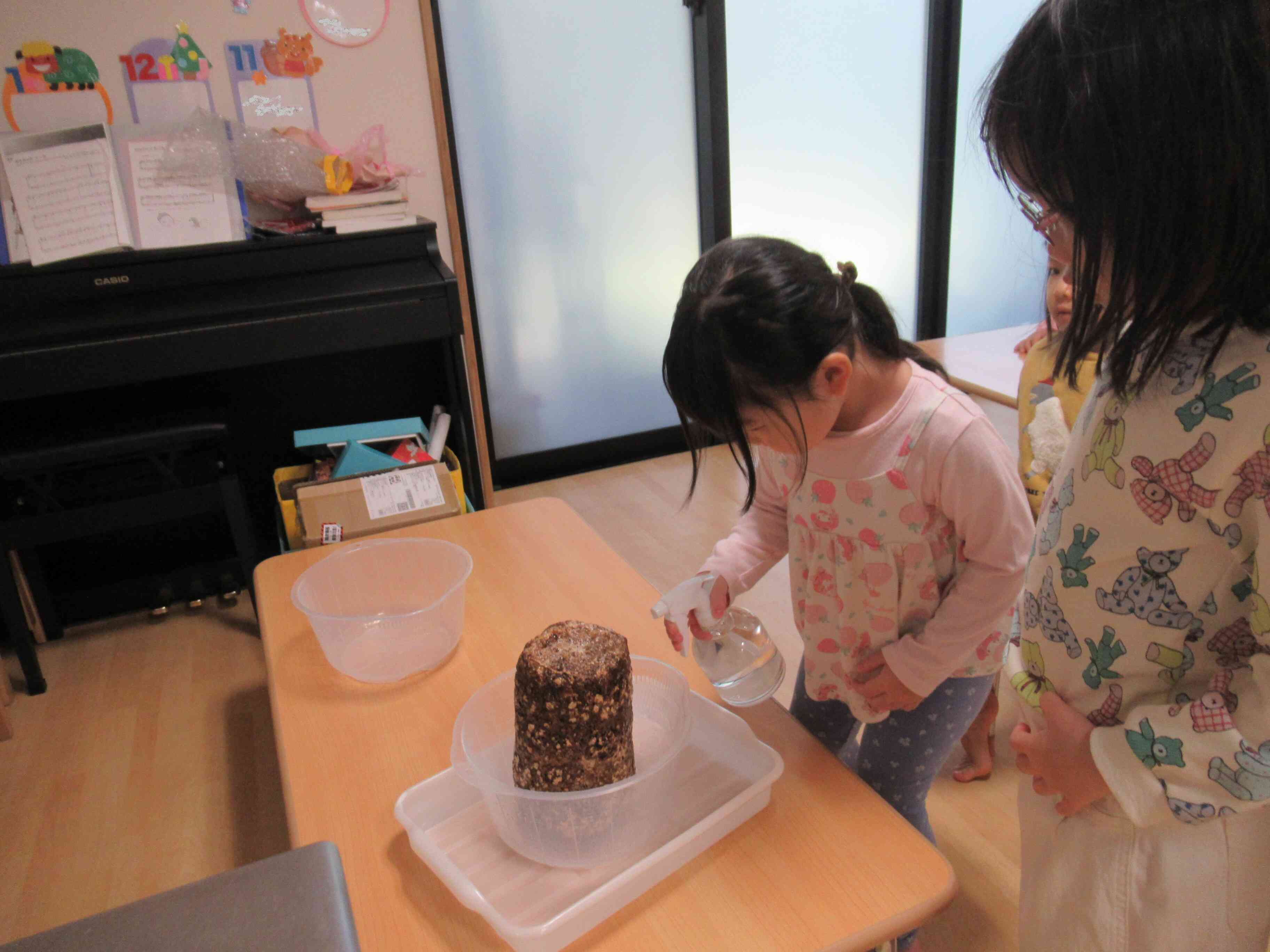 きのこの赤ちゃんがたくさん詰まった、菌床に水をあげる練習をしました。はじめに茶色のまだら模様の菌床をみたみんなは「ちょっときもちわるい・・・」と引いてみていたのですが、そばに近づいてお水をあげたり匂いをかいだりしているうちに・・・「白いところが赤ちゃんだと思う」「おおきくなるかな」「かわいいな」と大事に育てる気持ちが声になって出てきました。今日からみんなで育てるよ~!