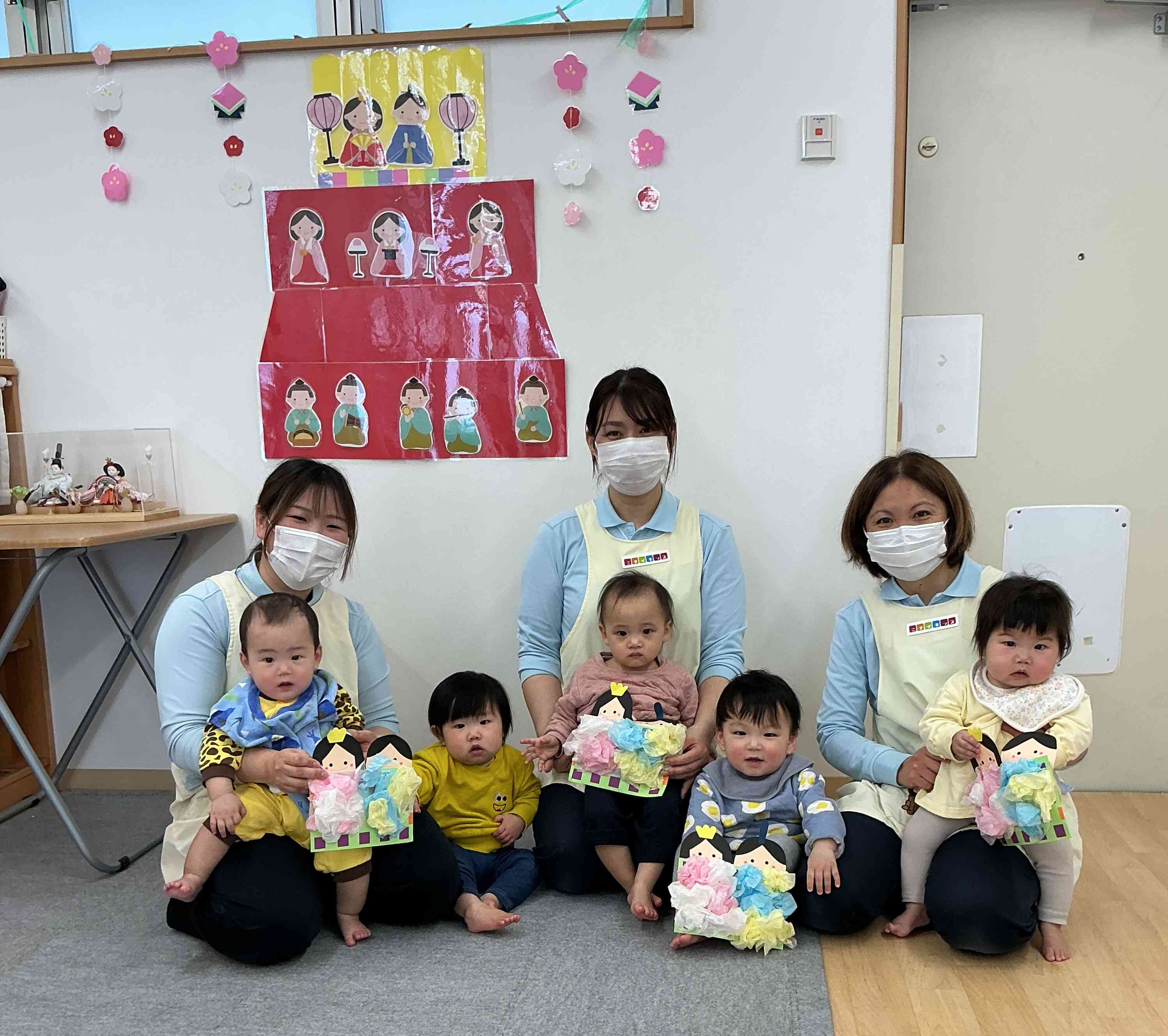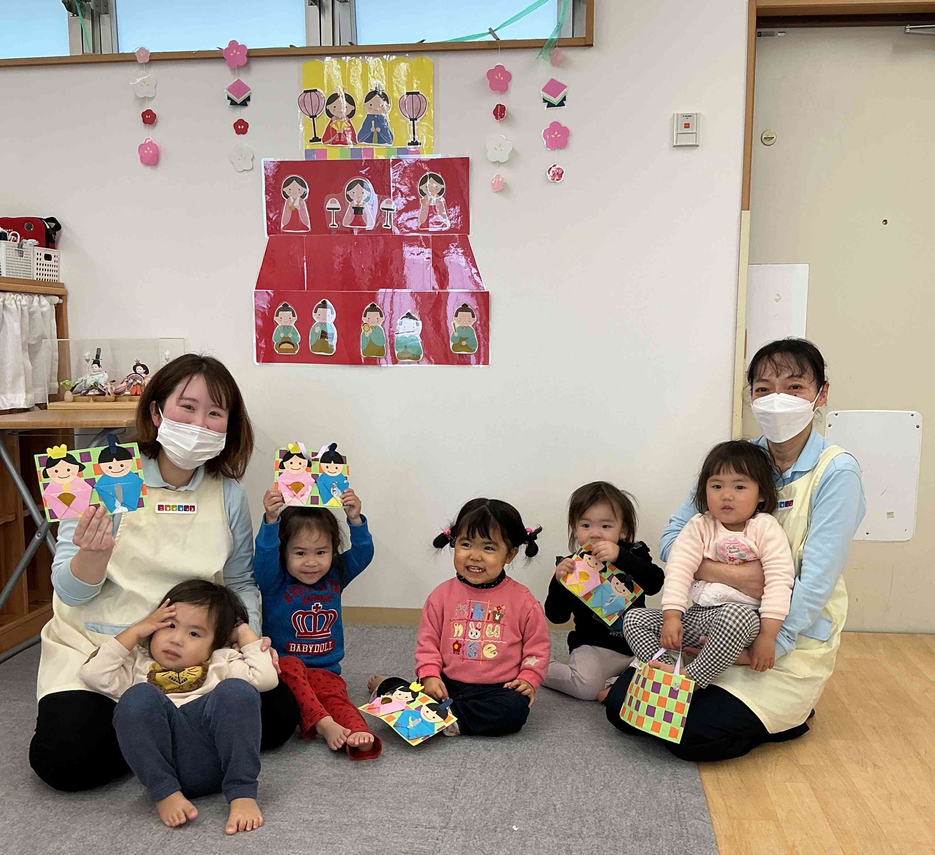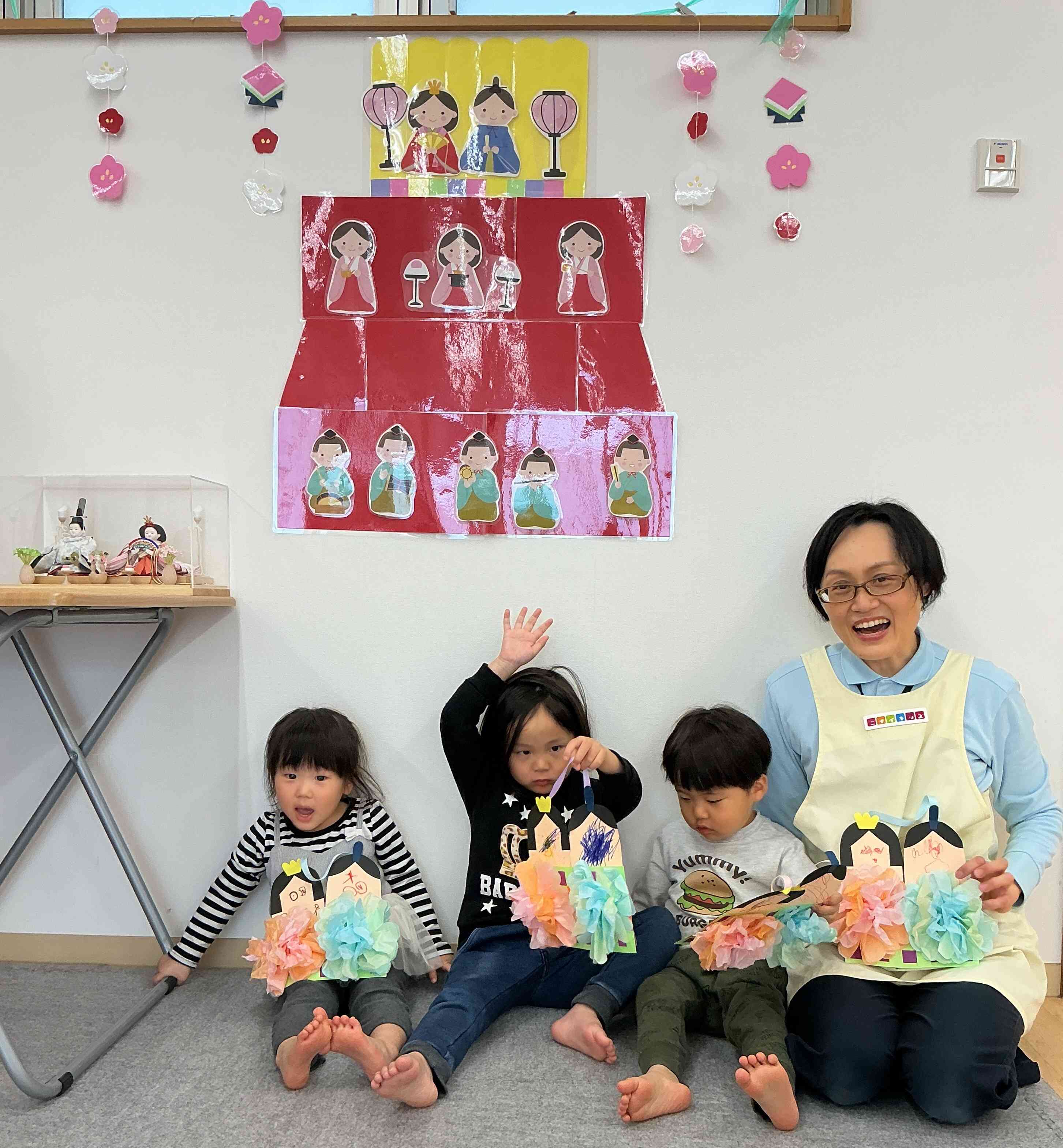 3月3日のひなまつりは、女の子の幸せと健やかな成長を願ってお祝いする日です。今日はきおうだい保育園の子どもたちの成長を願って皆でお祝いをしました。まずは、ちょっぴり難しいひなまつりの歌を歌いながら、雛壇におだいり様やおひな様を飾って…五人囃子も飾られるとますます華やか!!