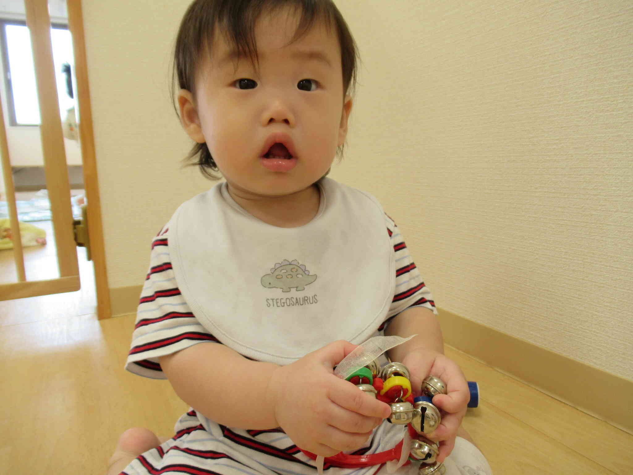 今日はみんなで楽器あそび!鈴や手作りマラカスカスタネットを出して歌に合わせて楽器を鳴らしました♪