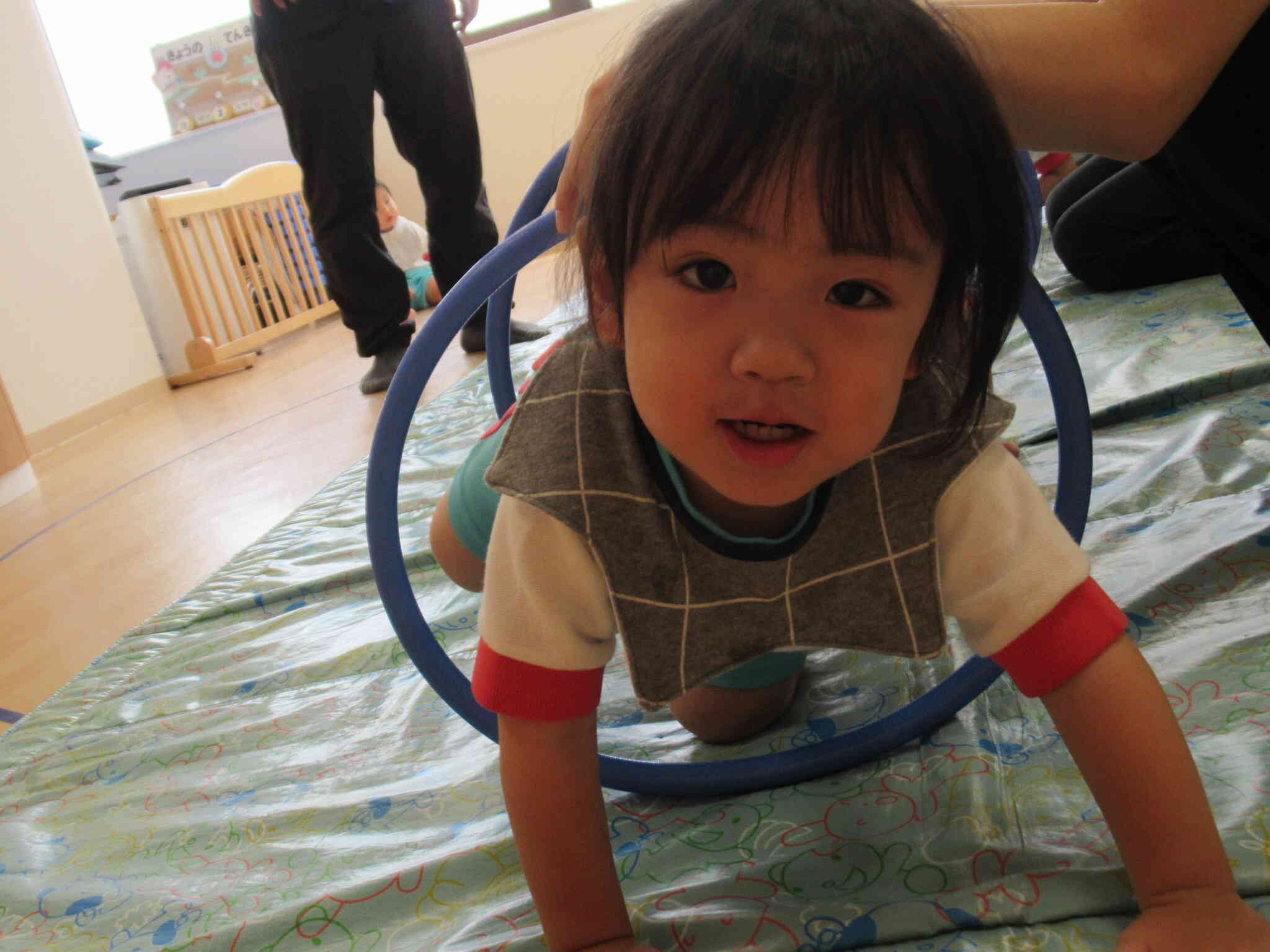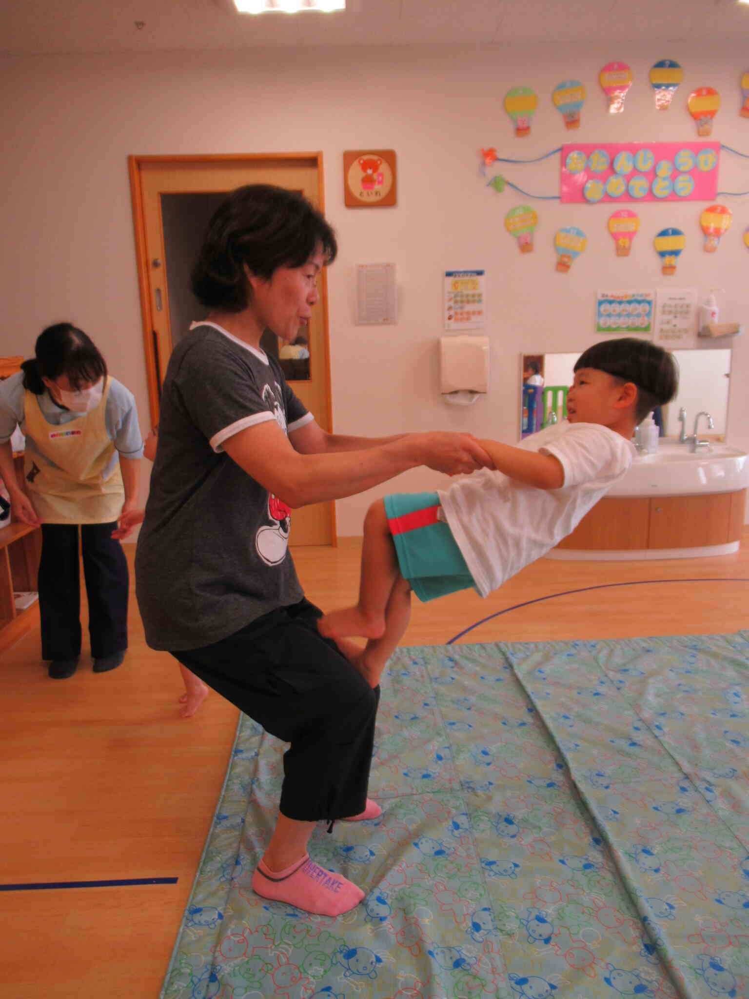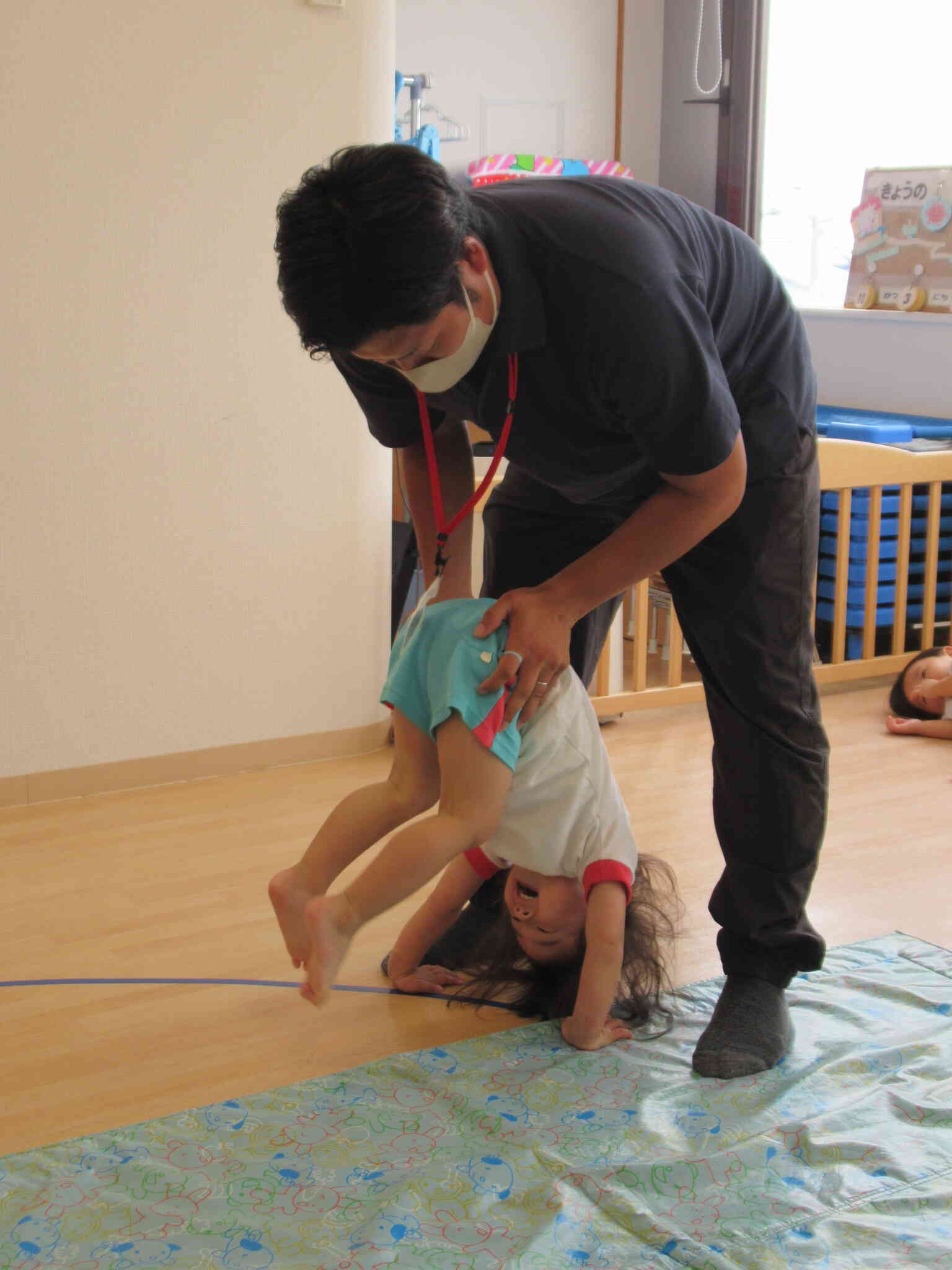 抱っこしてもらったらそのまま逆さになって手をつきます。