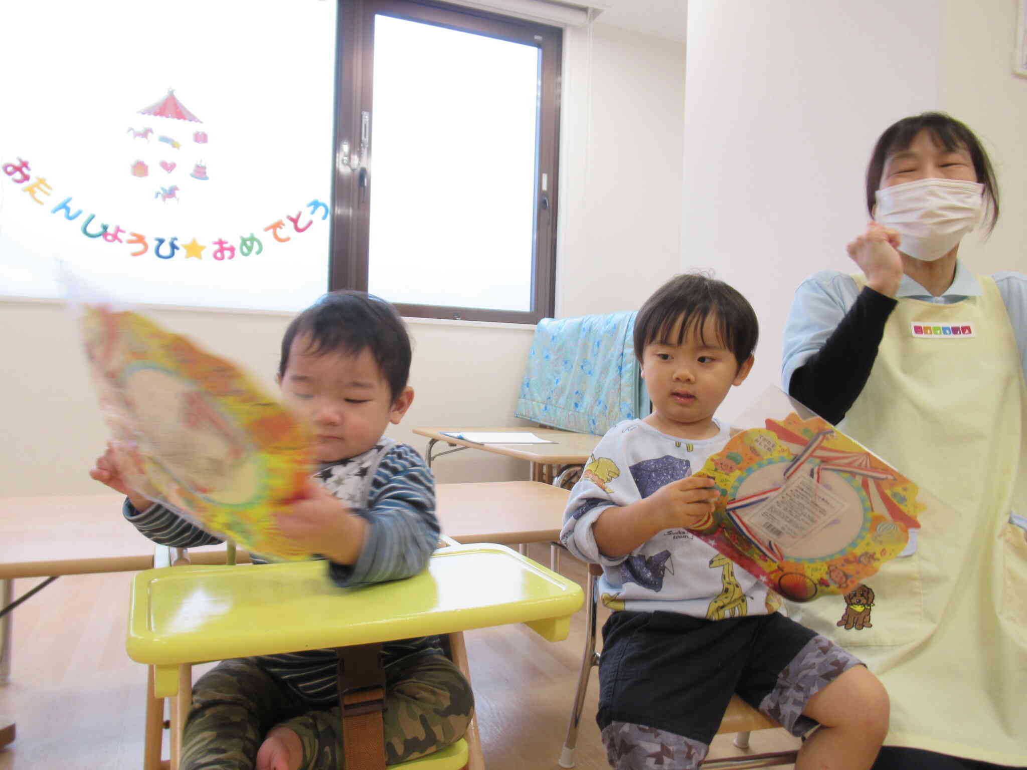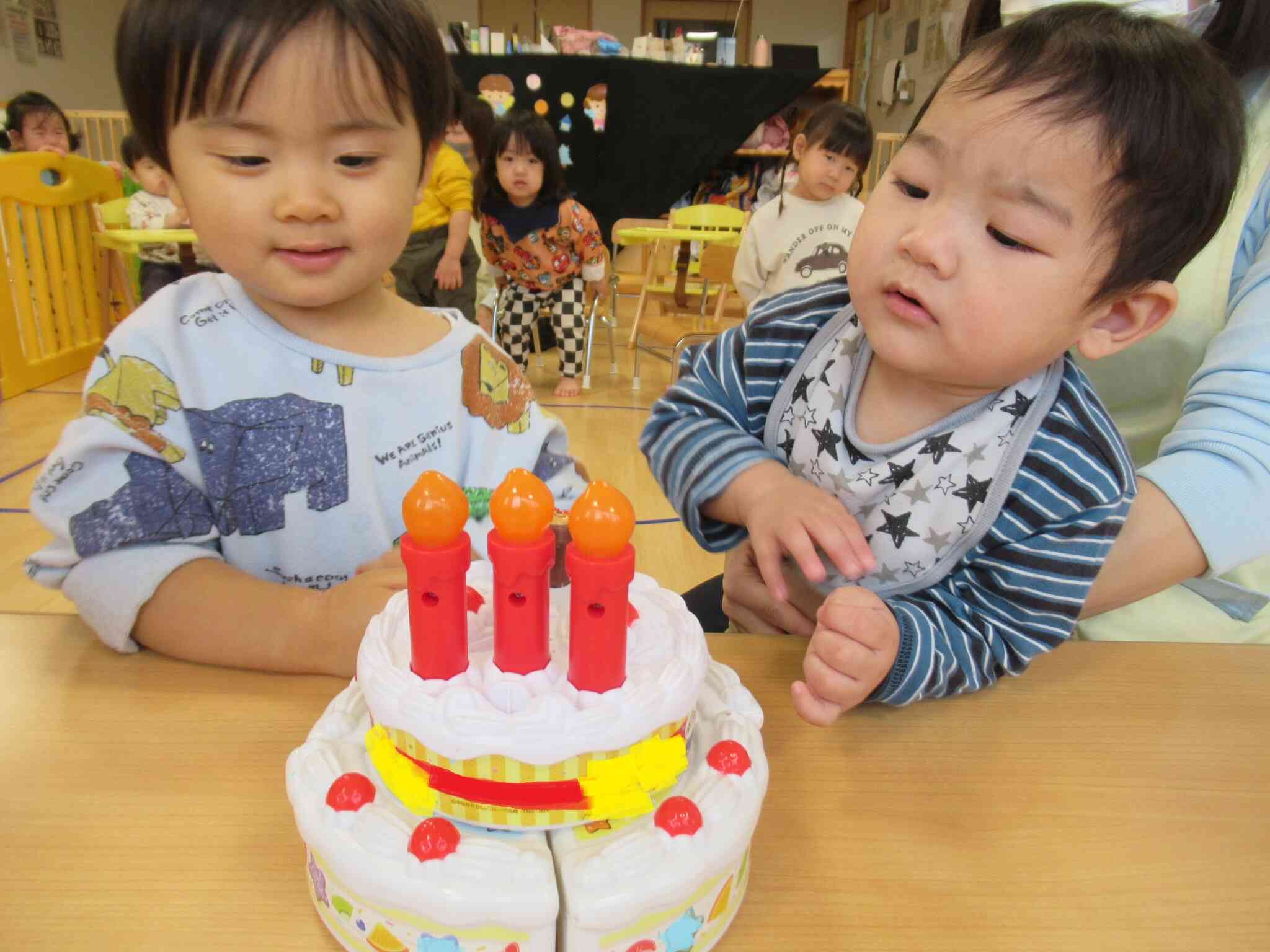今日は僕たちが主役!おたんじょうびおめでとう♪みんなからお祝いしてもらってプレゼントをもらって嬉しそうなふたりでした!