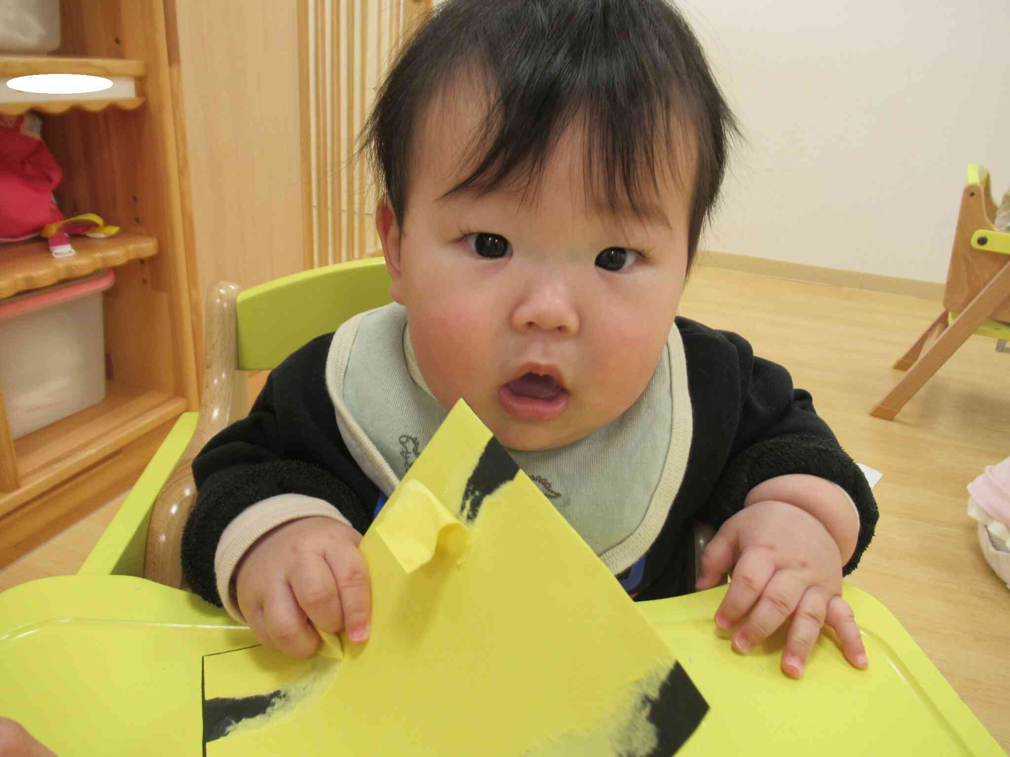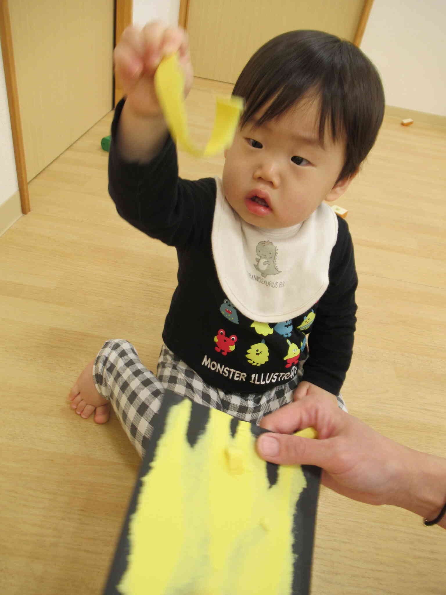 2月の製作をしました。先生に画用紙を支えてもらって”びりびりー”って破ったよ!