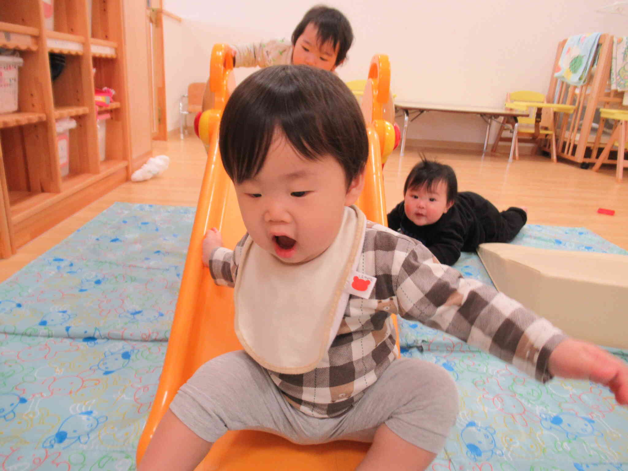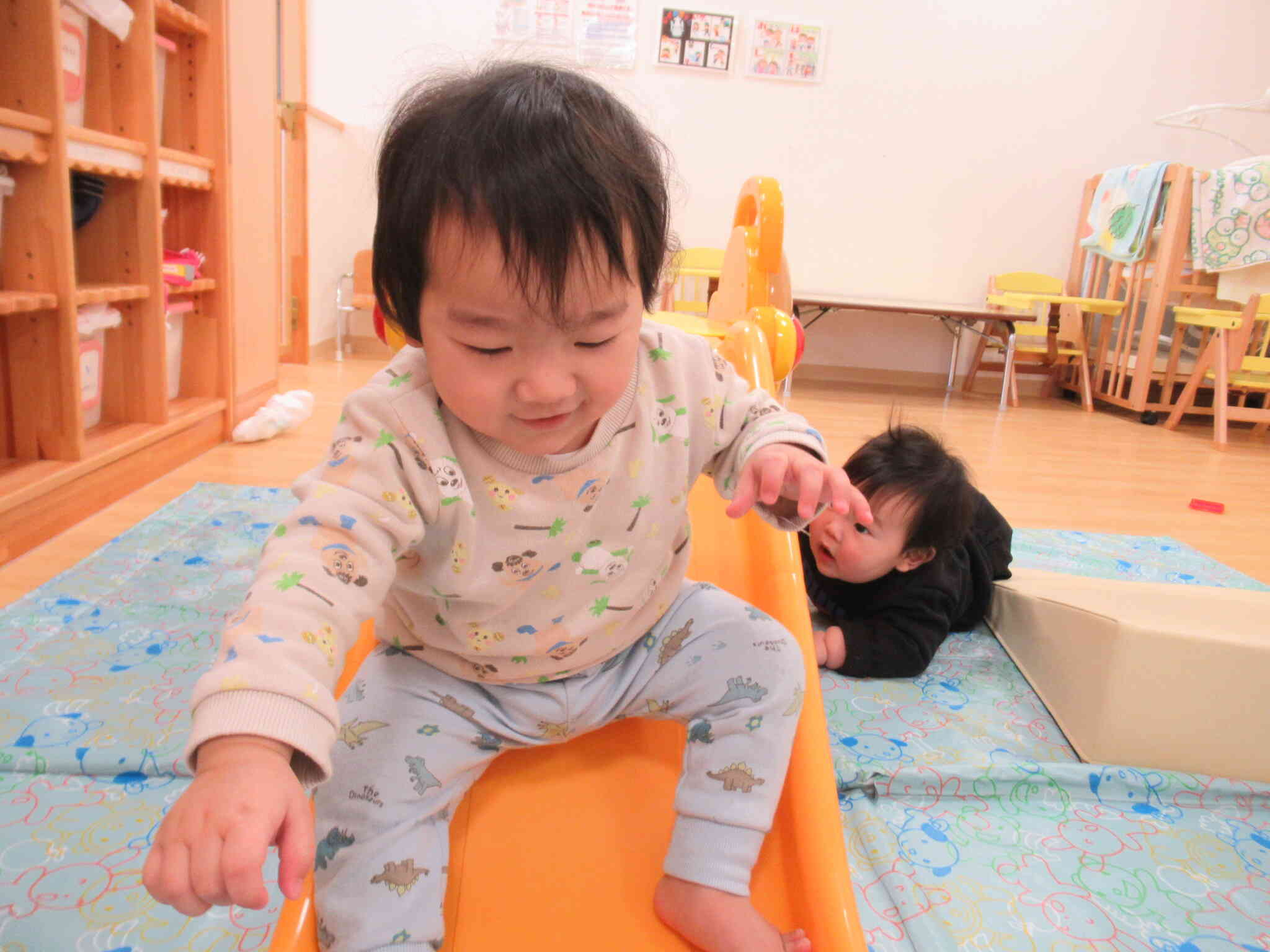 すべり台やマットを出して楽しみました!お友だちと顔を見合わせて”にっこり”とってもかわいい光景でした♪
