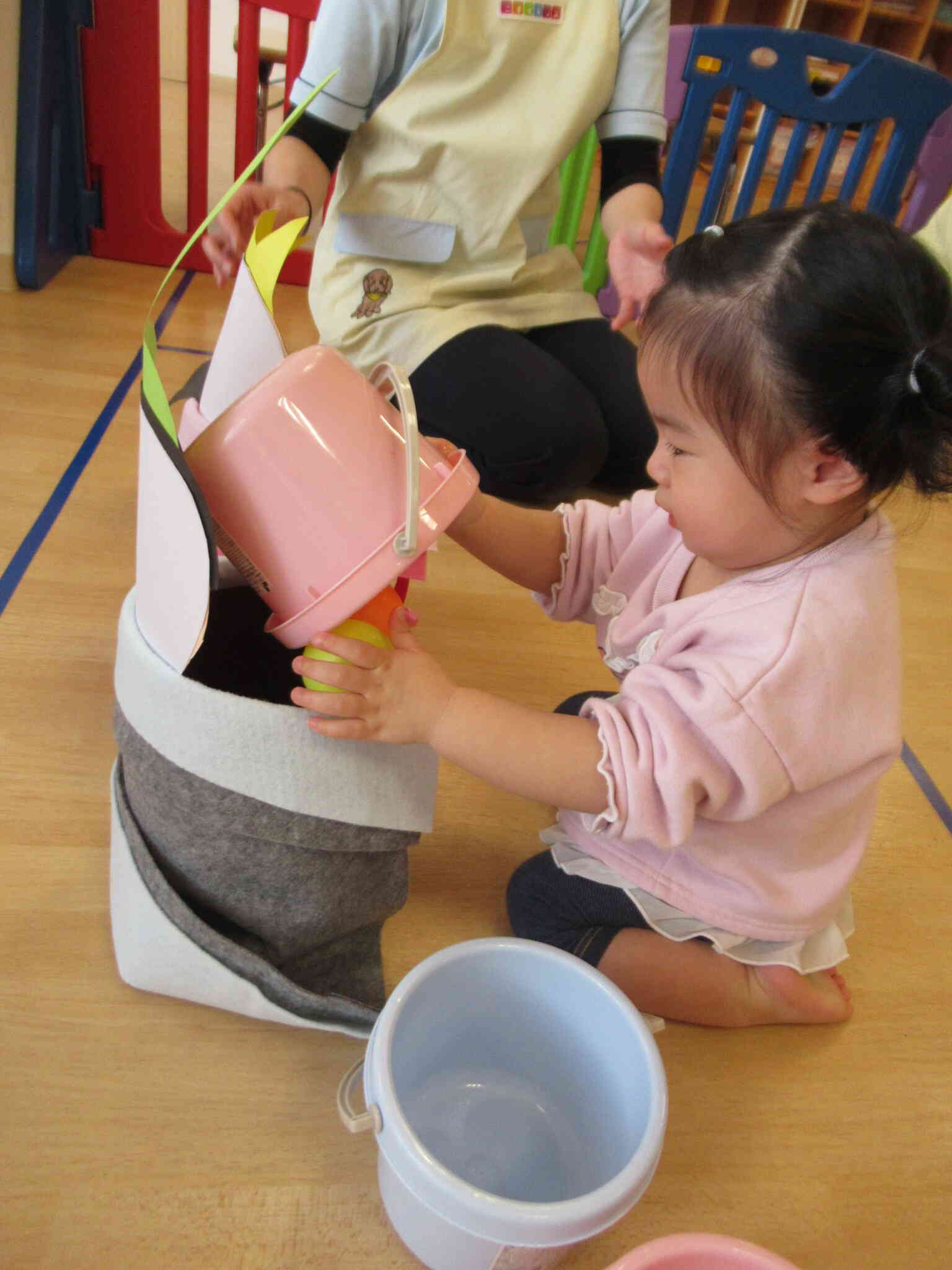 ”ジャー”っとボールの入ったバケツをひっくり返したほうが早いと気づいたお友だちでした
