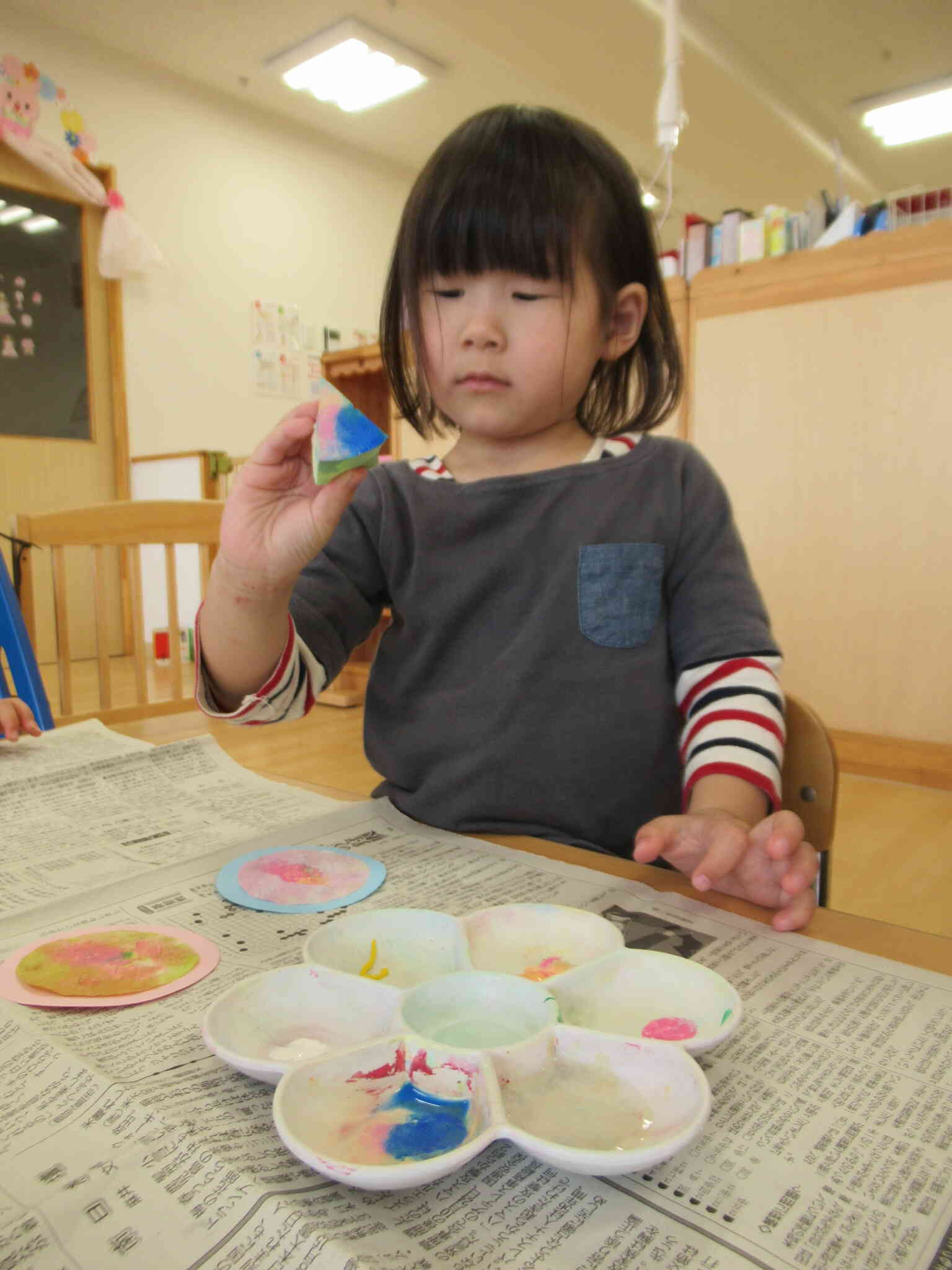 ひなまつり行事のあとは各クラスに戻って製作タイム☆おだいりさまとおひまさまのお洋服の製作をしました