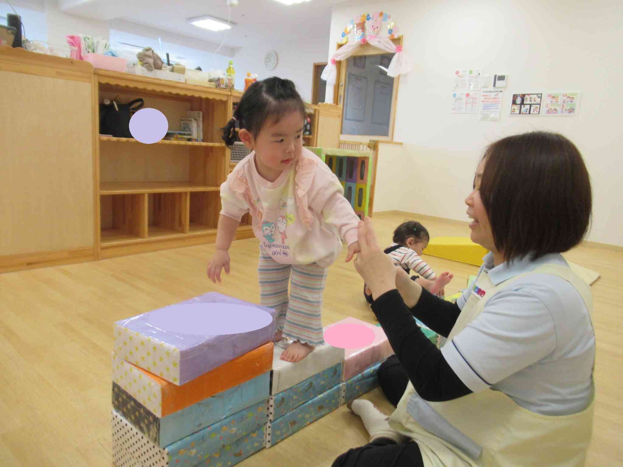 先生の手を借りながら高い平均台を登りました!何回もチャレンジするお友だちでした。