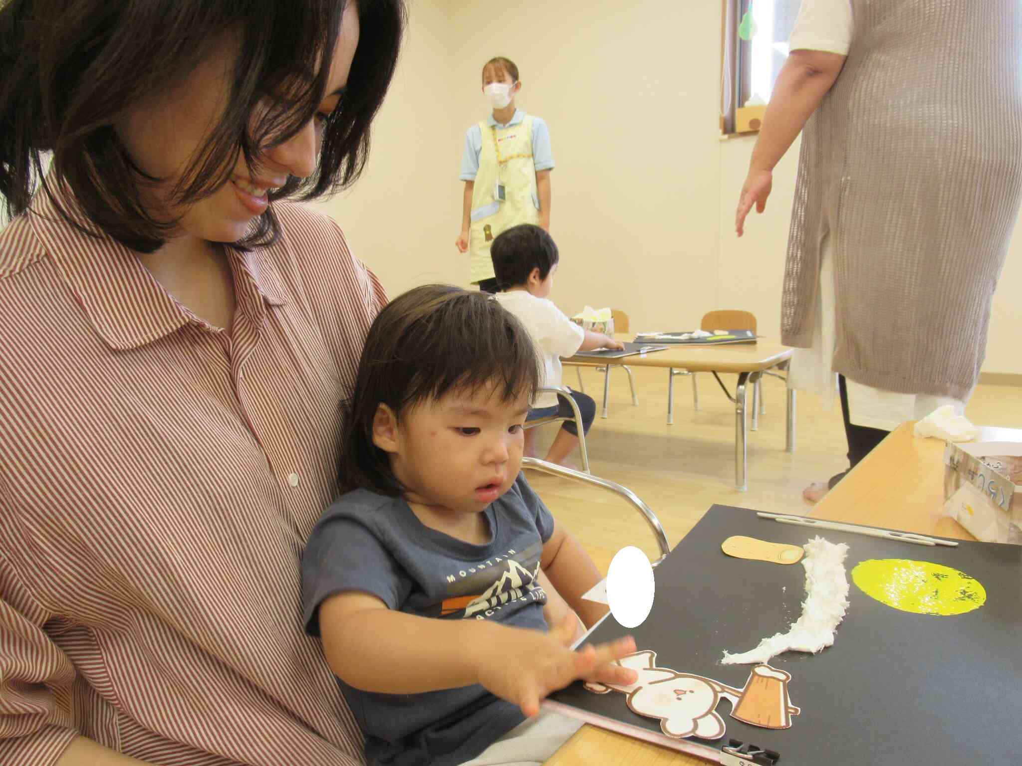 お月見に関する絵本から、実際にお月見づくりに挑戦です。黄色の絵の具をスポンジでとってスタンピングをすると、お月見の出来上がり。「3.2.1」の合図で紙をめくってみると「わぁーっ!」と歓声が上がりました。