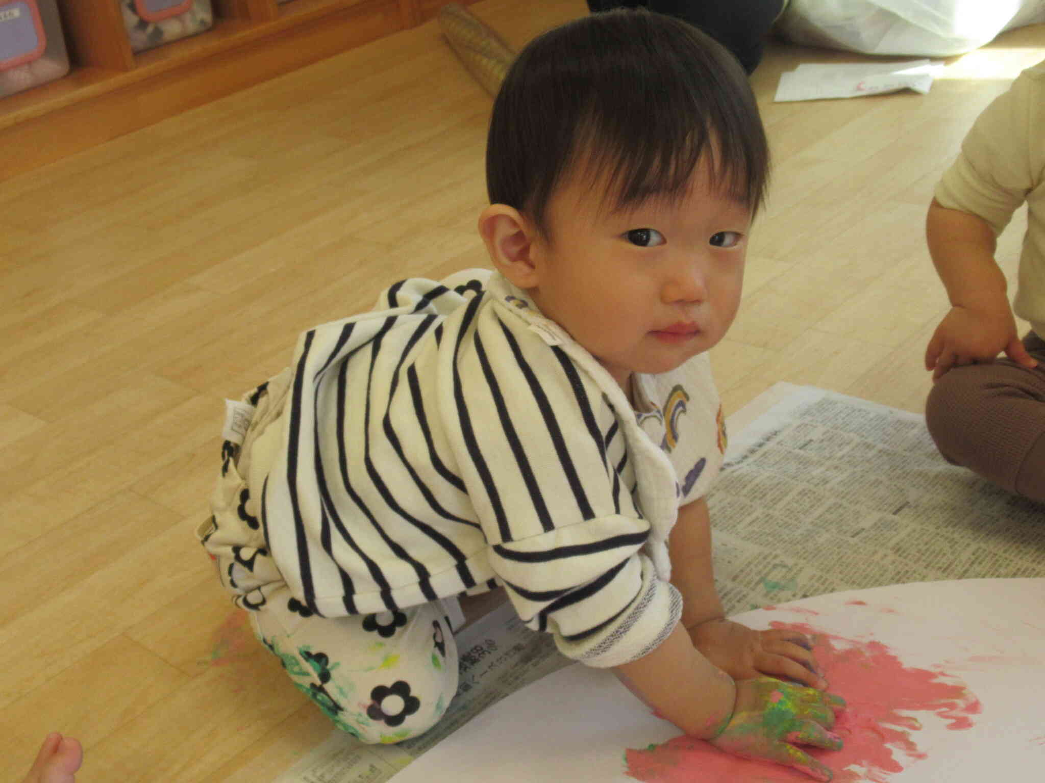 絵の具を「もっとちょうだい」と手を伸ばして保育者から手のひらに塗ってもらうと嬉しそうにしていました。大きな画用紙にペタペタ大変だったけど頑張りました。