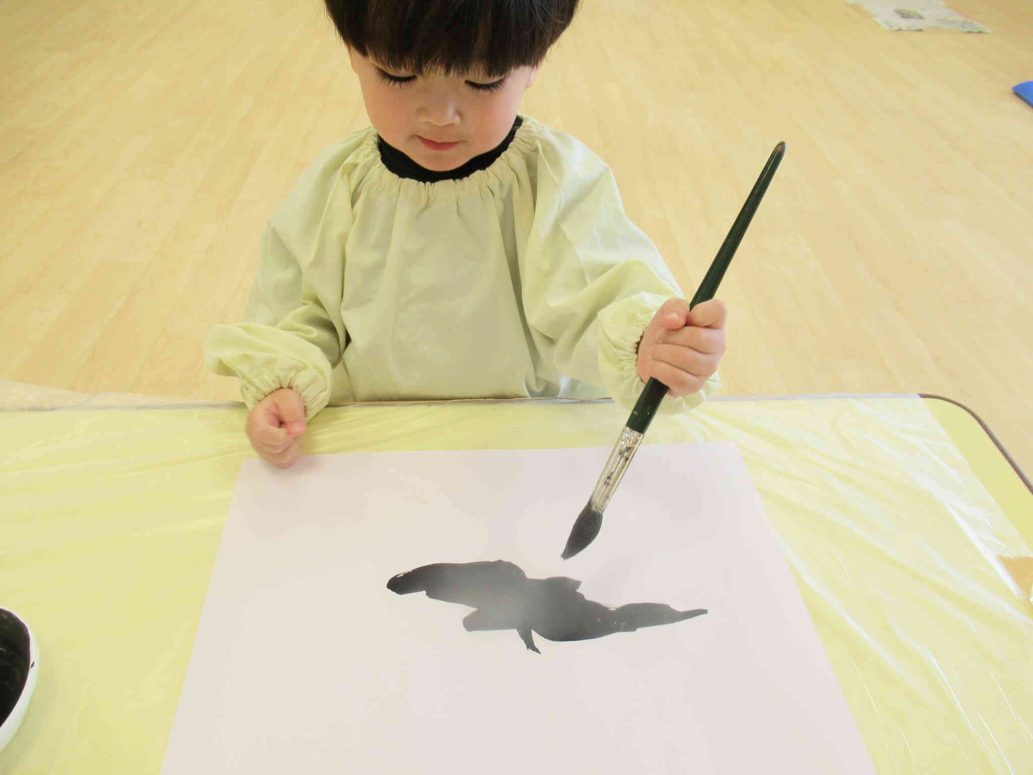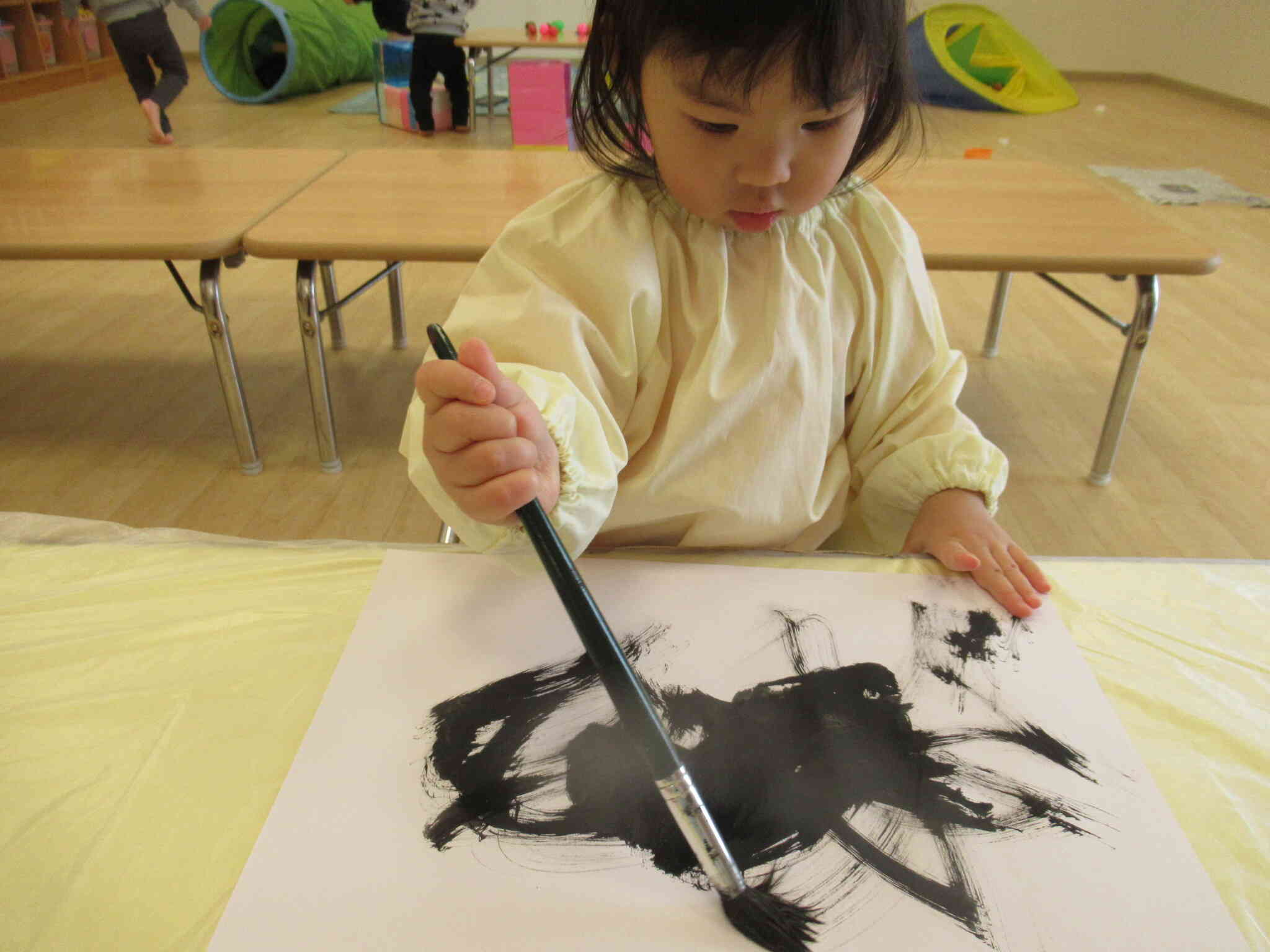 筆で画用紙いっぱいに塗り広げたり、ペタペタと点を打つように置いてみたりと夢中になって取り組んでいました。