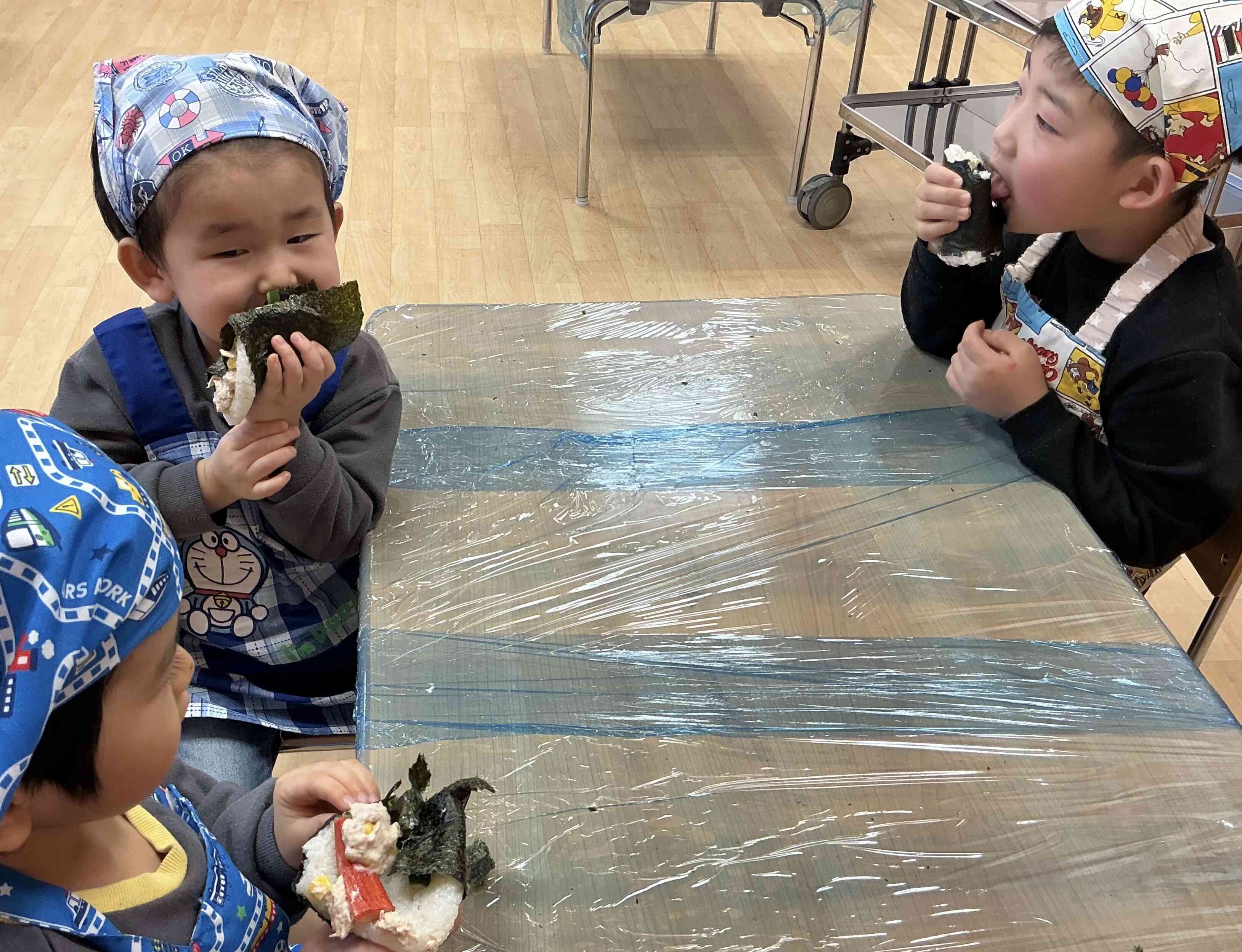 節分のおやつに恵方巻き作りをしました。1人づつ海苔にご飯、きゅうり、カニカマ棒、ツナマヨを乗せて、上手に巻いていきました。自分で巻いて作った、恵方巻きはとても美味しく出来ました。