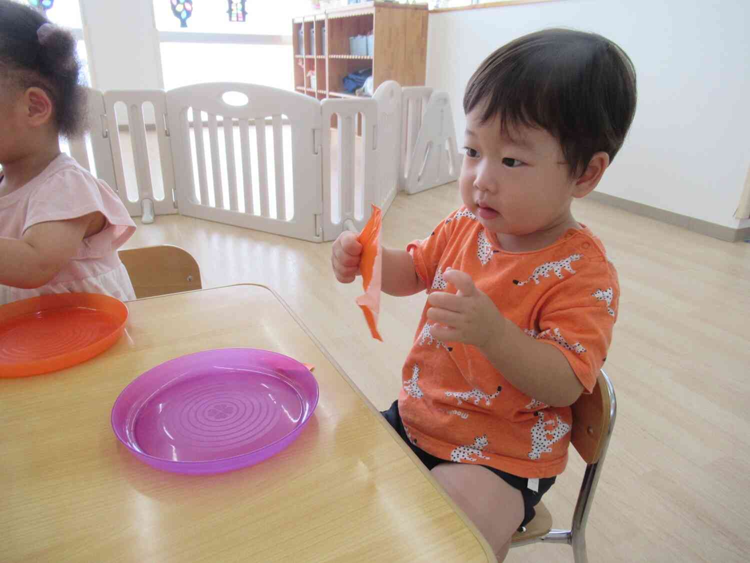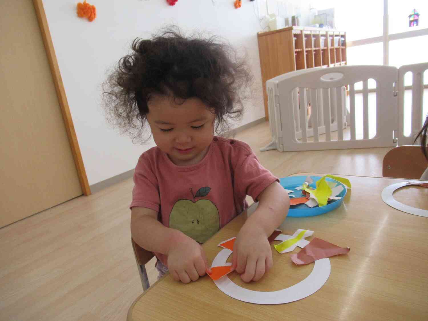 9月のテーマ「きのこ」にあわせて、子どもたちの大好きな製作を行いました。先生のお話をよく聞いて、ペタペタ貼ったり、ビリビリちぎったりと、自由に楽しみながら取り組みましたよ。「きっきっきのこ♪」ときのこの歌を歌いながら楽しむ様子もありました。