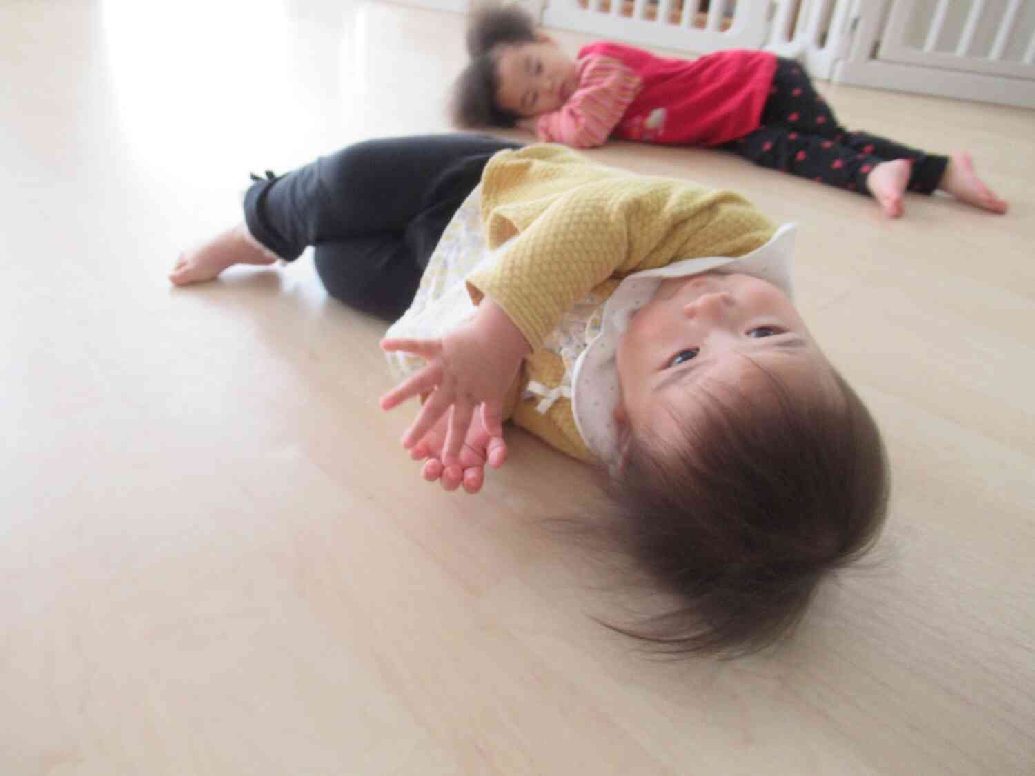 いっぱい体を動かしたあとはちょっと休憩。心地よい音楽に合わせてみんなで床に寝そべってリラックスモードの子どもたちです。先生もお友だちも一緒の空間が嬉しくて「キャハハ〜」と笑顔が溢れます。
