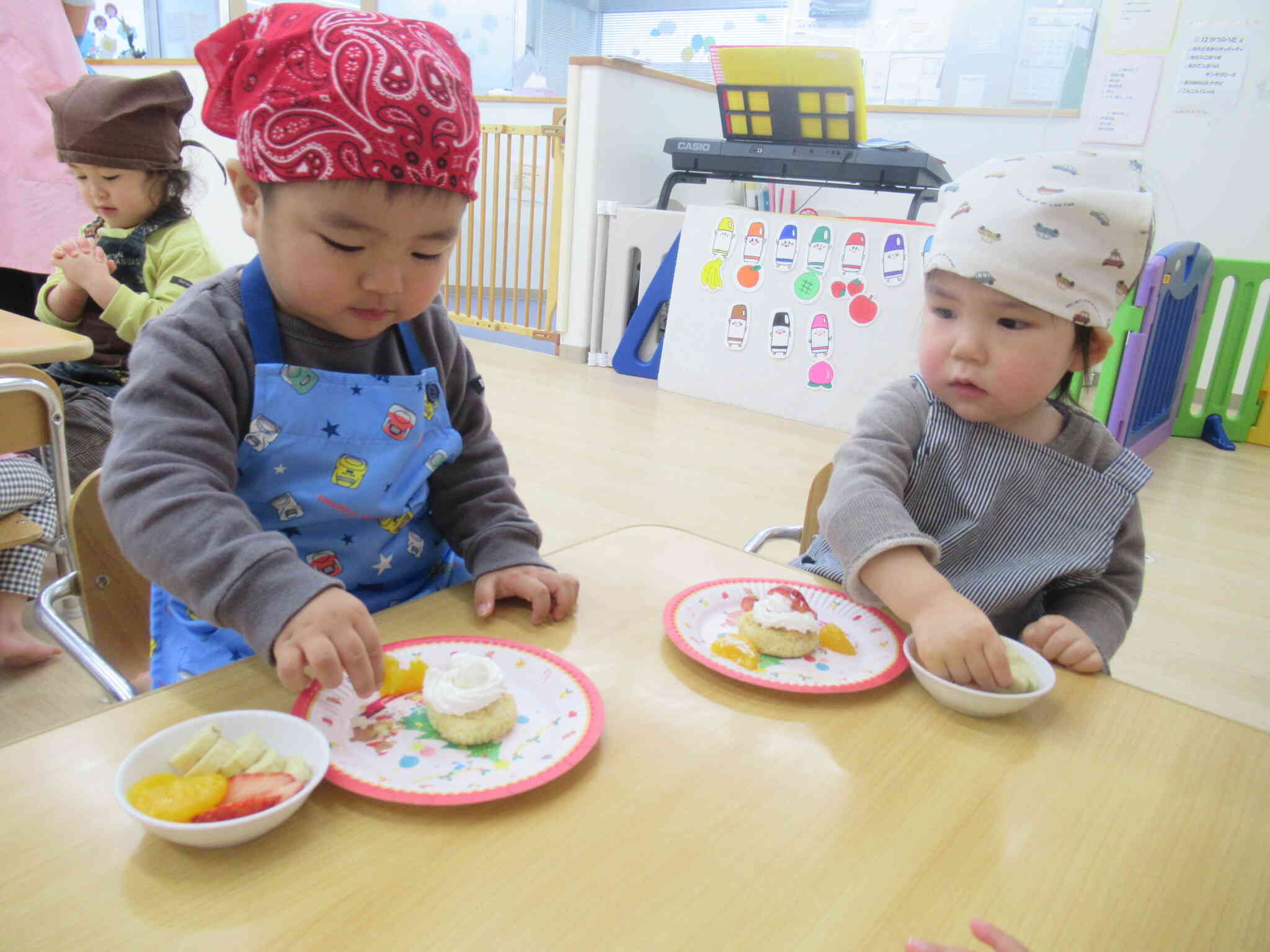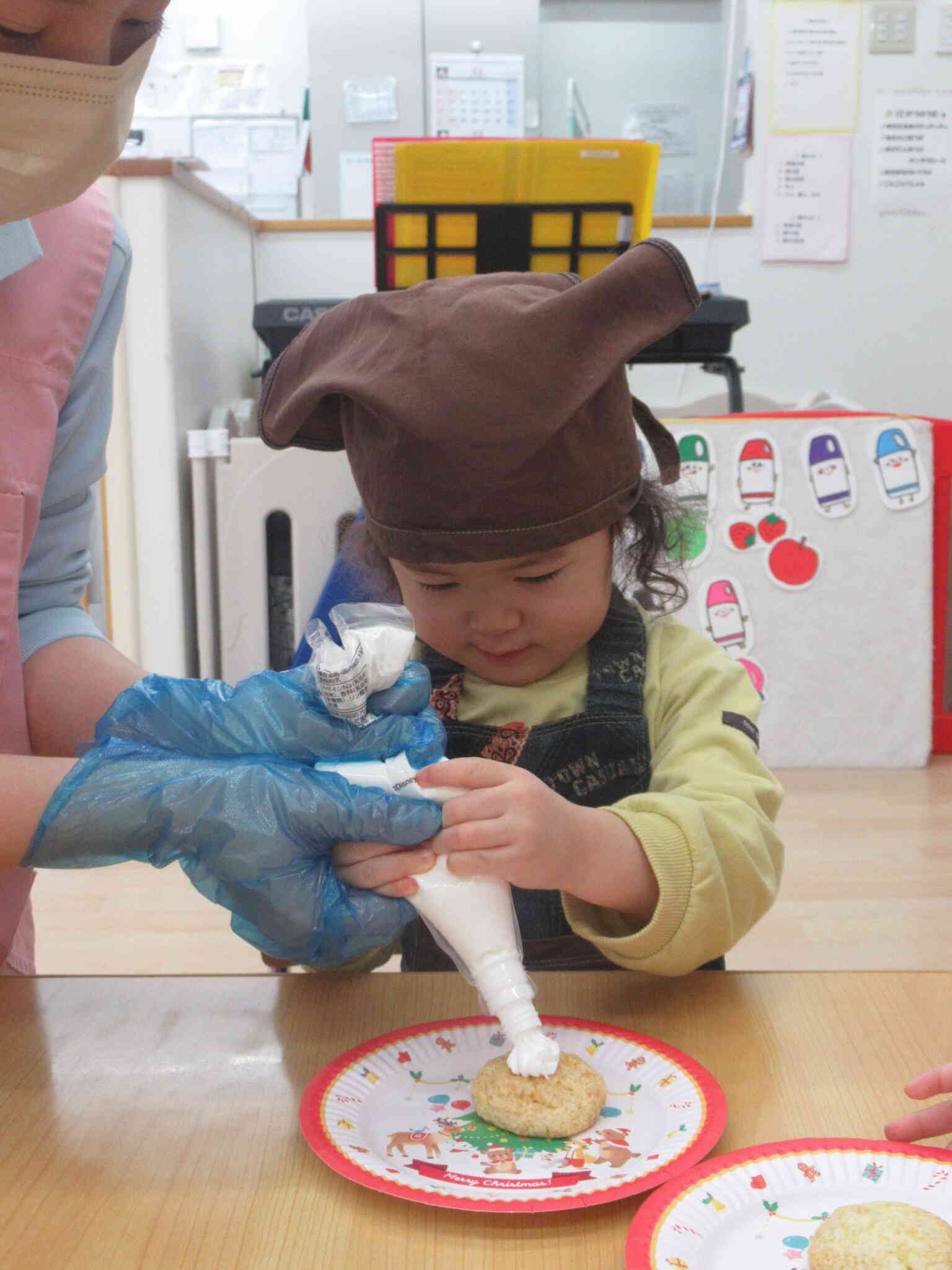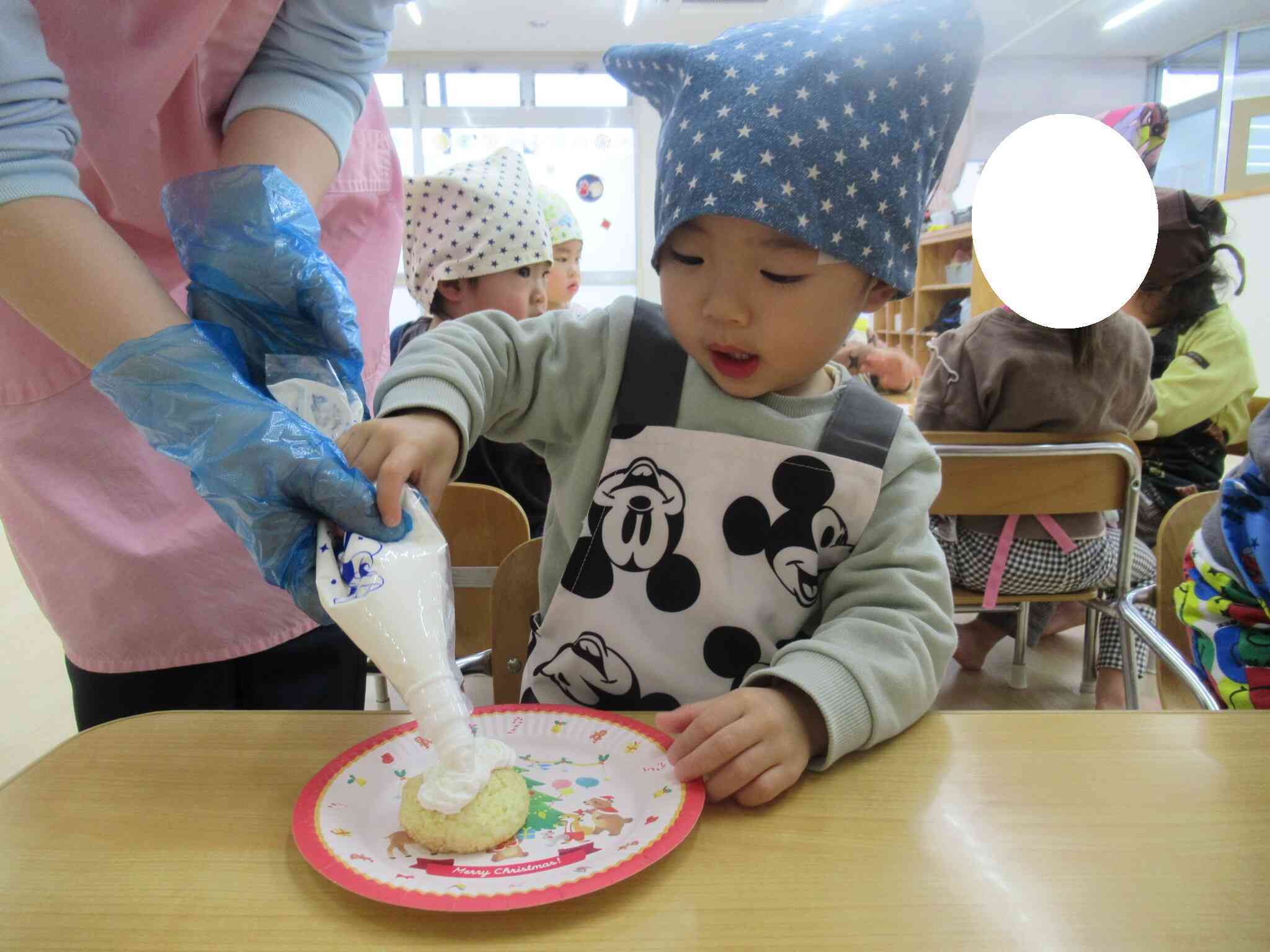 12月24日のクリスマスイブにちなみ、食育活動で午後おやつに1・2歳児さんがケーキのデコレーションをしました。先生に手伝ってもらいながら、上手に生クリームをしぼることができました。