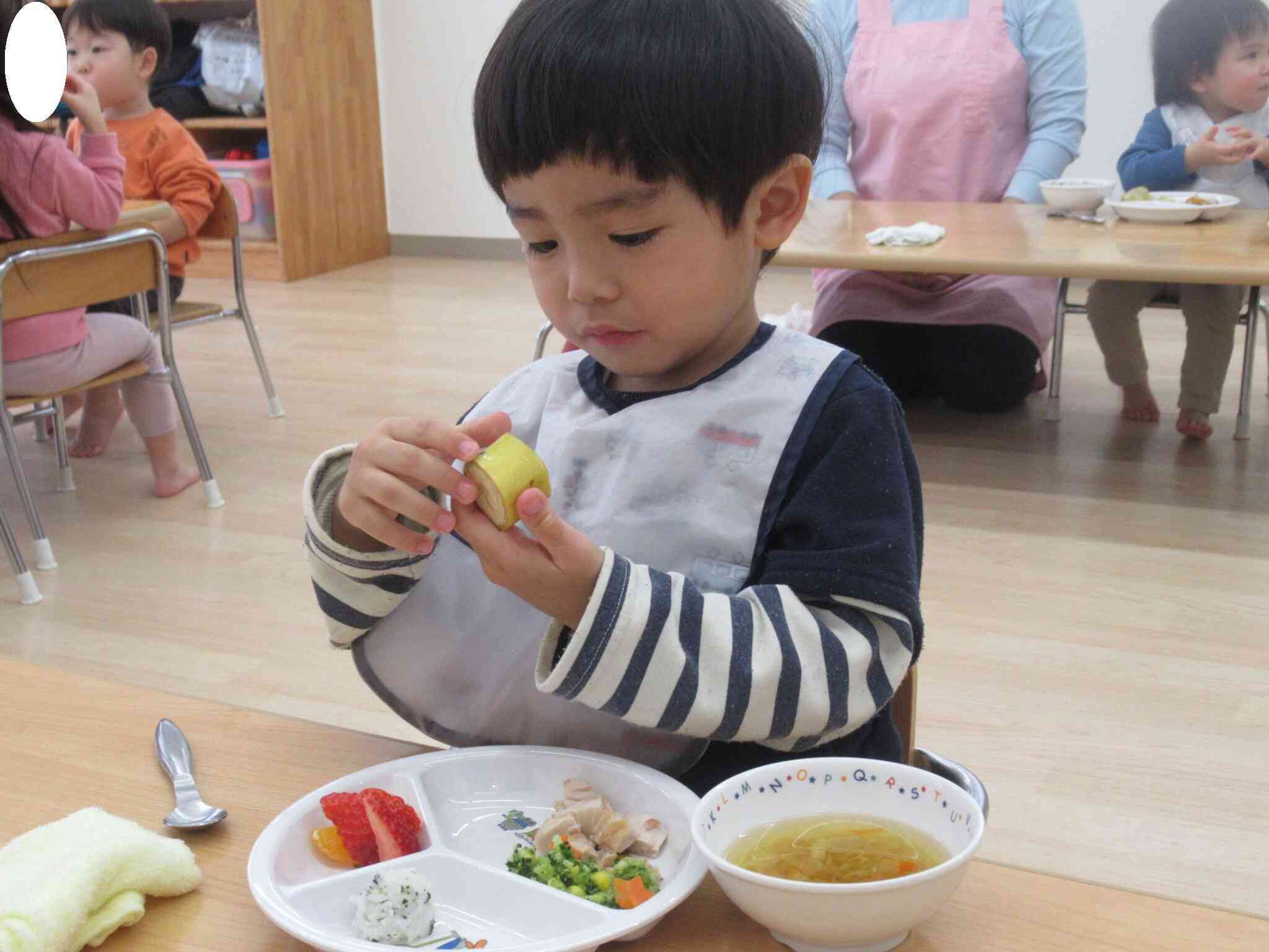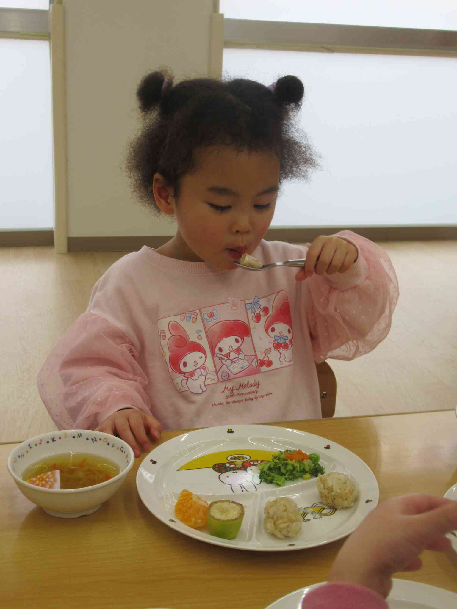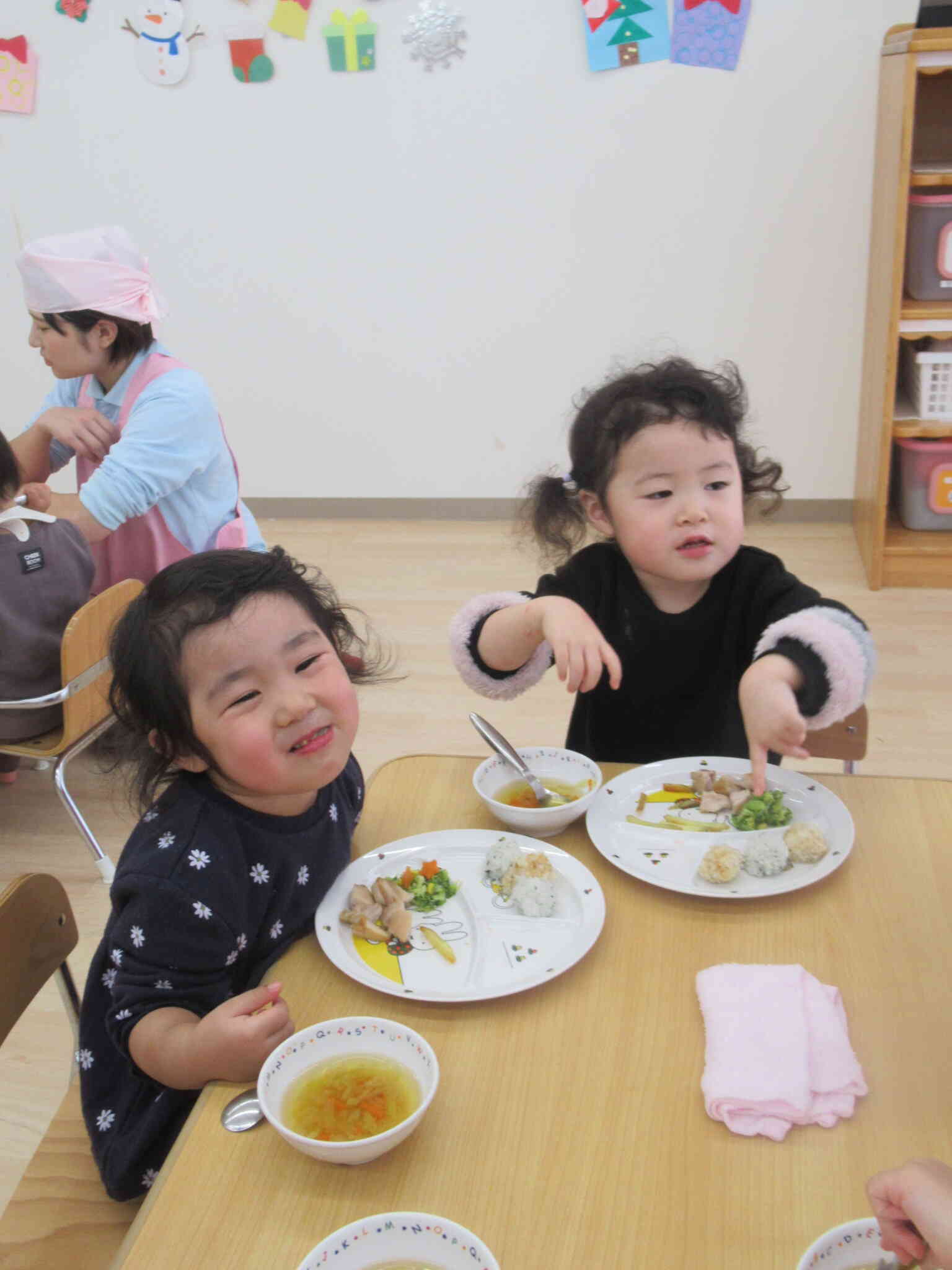 今日はクリスマスということで、子どもたちに人気のあるメニューをバイキング風にしました。真っ先におにぎりを食べる子やフルーツを食べる子などそれぞれ好きなものから食べていました。