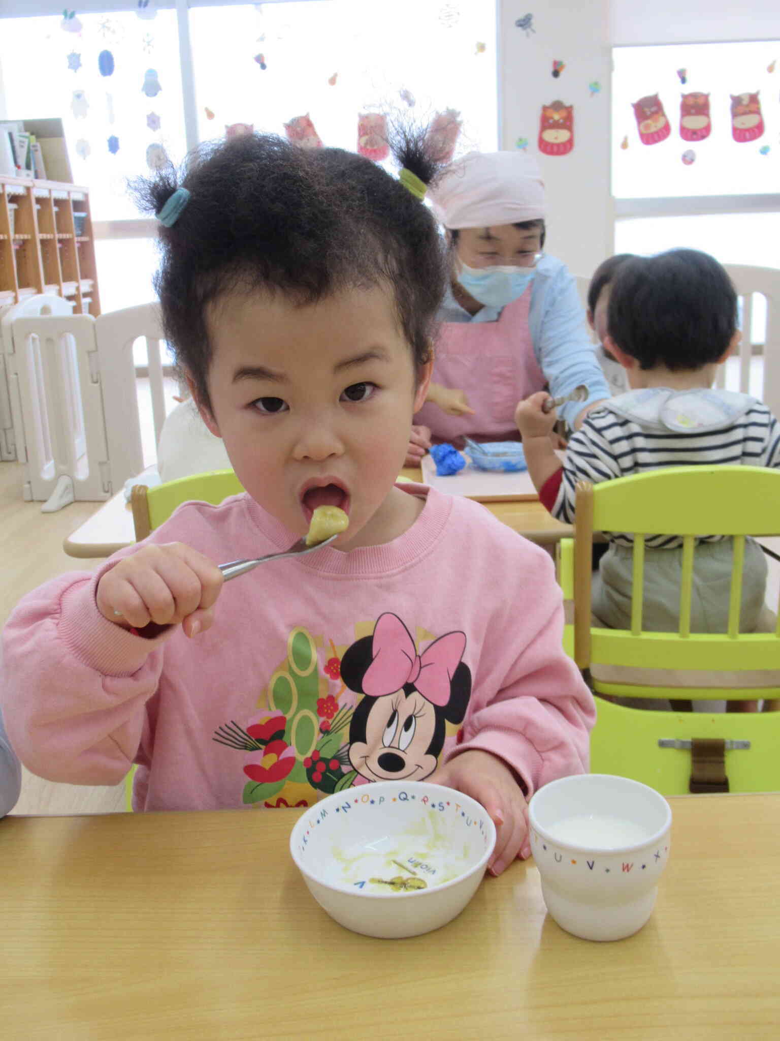 小正月行事でおもちつきごっこを楽しんだ後、さといもで作ったお団子にみたらしをかけたおやつを食べました。甘じょっぱいみたらし味は子どもたちにも大人気。おかわりもあっという間になくなりました。