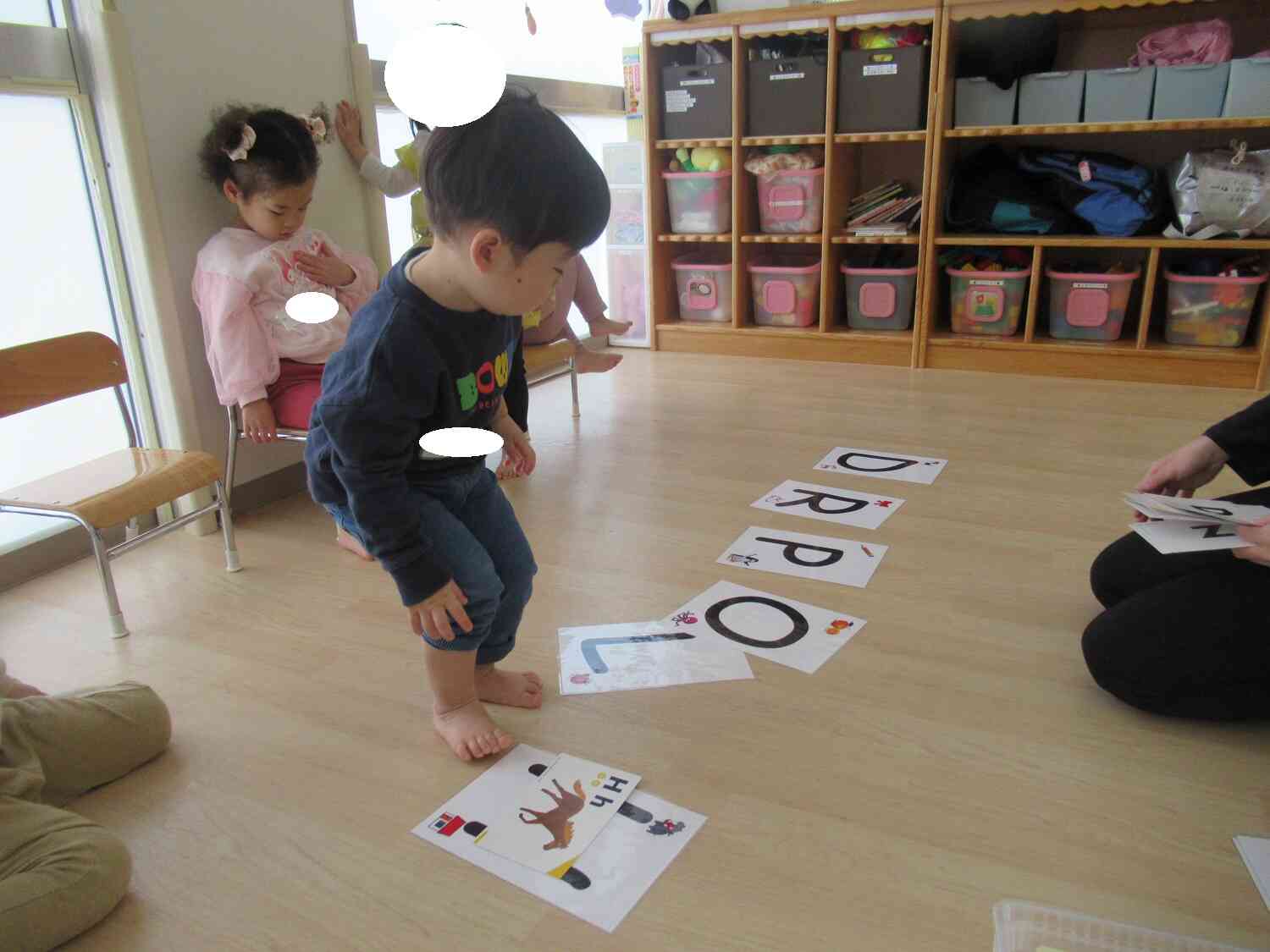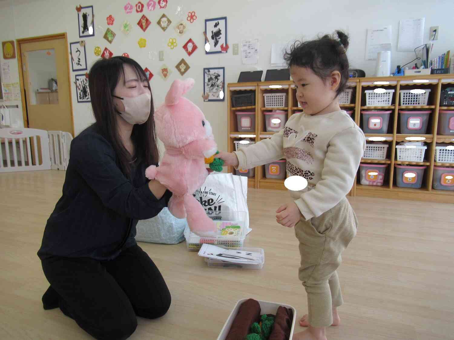 「今日は英語レッスンがあります」とお話しすると、「やったー!」「今日は何をするのかな?」と毎回の英語レッスンをとても楽しみにしている子どもたちです。この日は、毛糸でできたにんじんを抜いてうさぎさんにたべさせてあげたり、同じ文字や絵柄を見付けたり、今回も盛りだくさんで楽しみました。次の英語レッスンも楽しみです。
