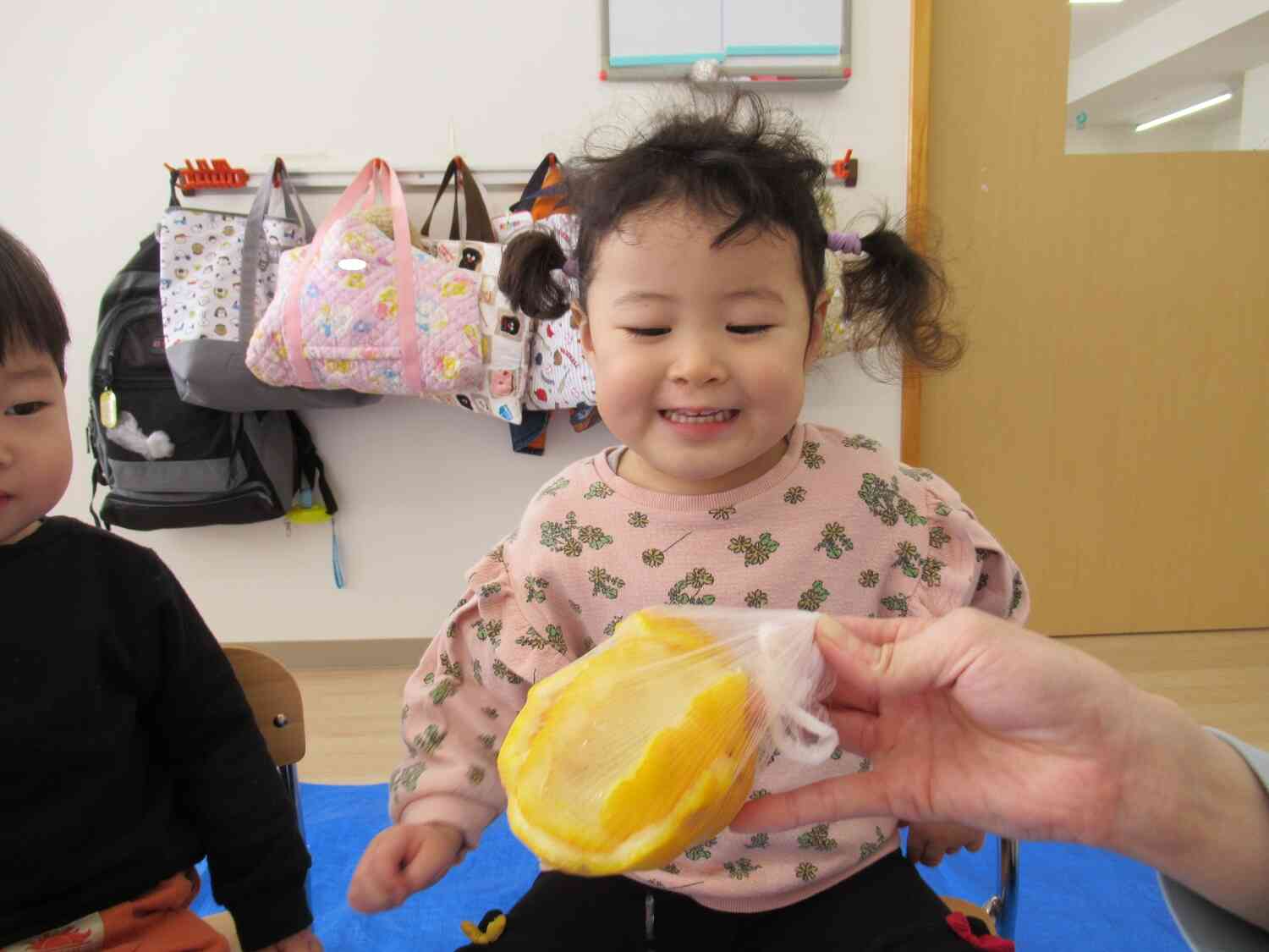 今回はゆずの皮をむいてお湯の中に入れてみました。顔をゆずに近づけて匂いをくんくん嗅ぐと「いい匂い!」「なんだこれ~」とそれぞれ思い思いにお話して感想を教えてくれるのでした。五感を使って存分にゆず湯を楽しみました。