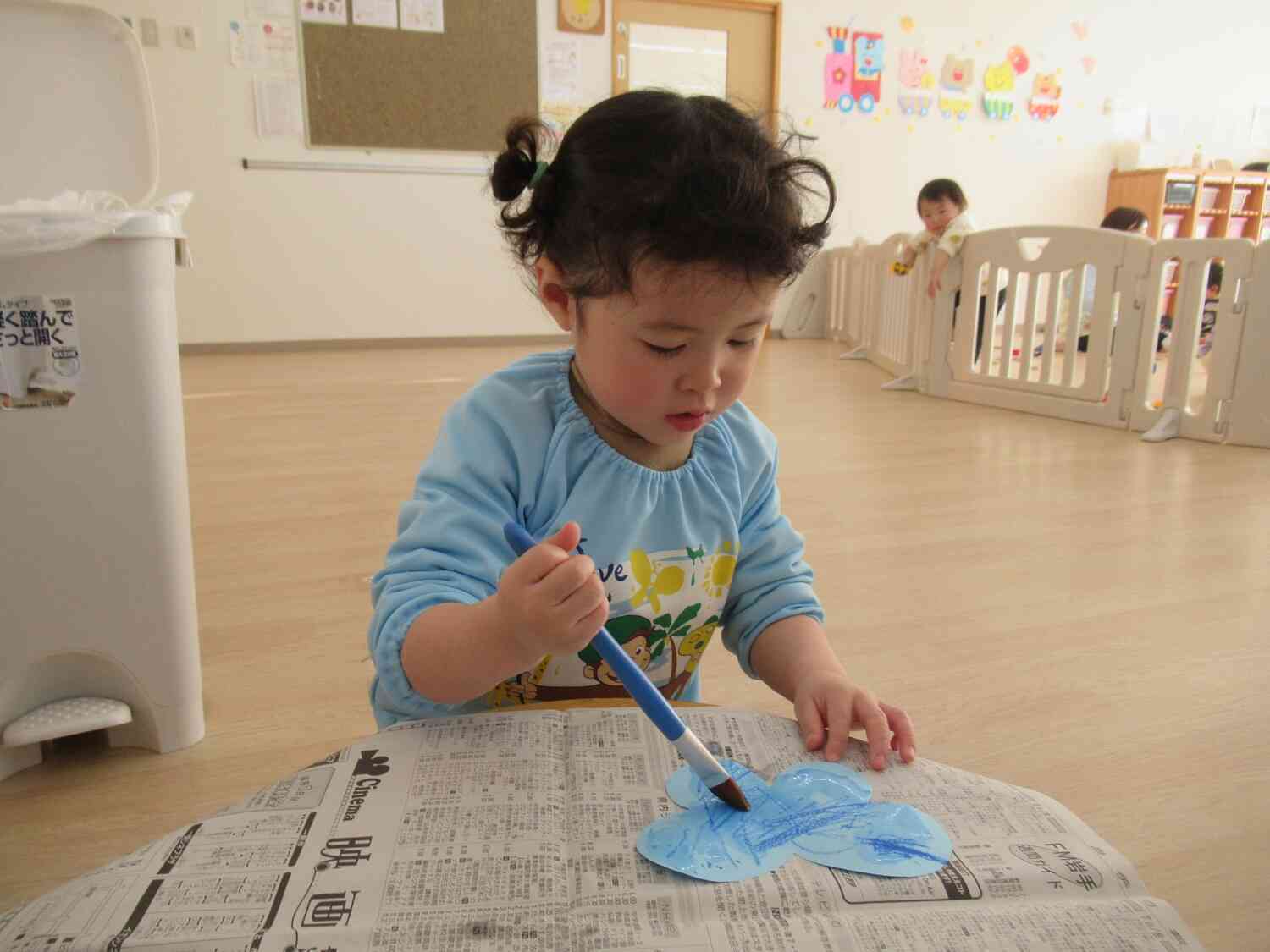 春が近づいてきて、ちょうちょの製作を行いました。まずは好きな色の画用紙とクレヨンを選んでかきかき!出来上がった時には「かわいいちょうちょを描きました」「怒ってるちょうちょです」と自分の描いたものを紹介してくれましたよ。次の日は、クレヨンの上から絵の具をぬりぬり。クレヨンと重なって素敵なちょうちょができあがりました。