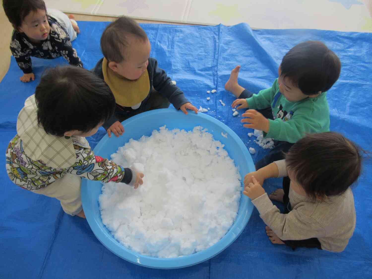 雪が積もった日に早速雪に触れる体験をしてみました。タライに雪をたっぷり入れ、目の前に出すと目をキラキラ輝かせて興味津々な子どもたち。おそるおそる触ってみる子、大胆に掴んで遊ぶ子・・・さまざまな姿が見られましたよ。