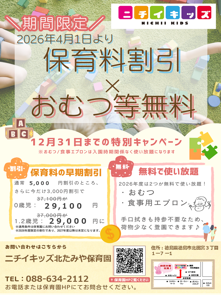 2026年度入園・継続特典!保育料の割引 & おむつ等の無償提供を開始します!