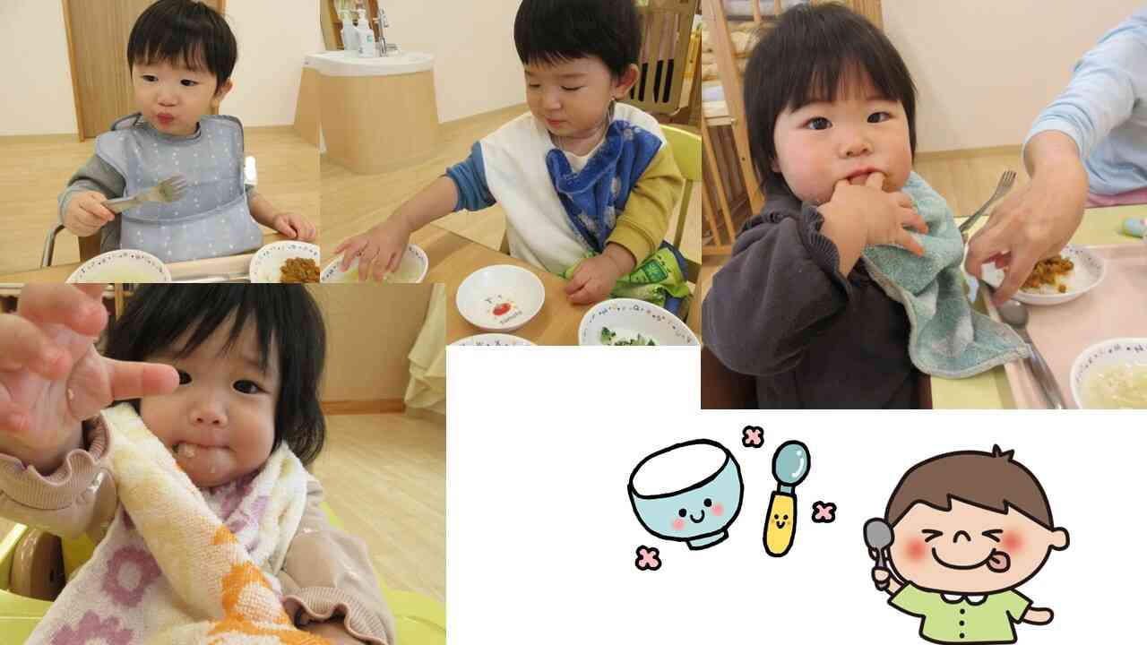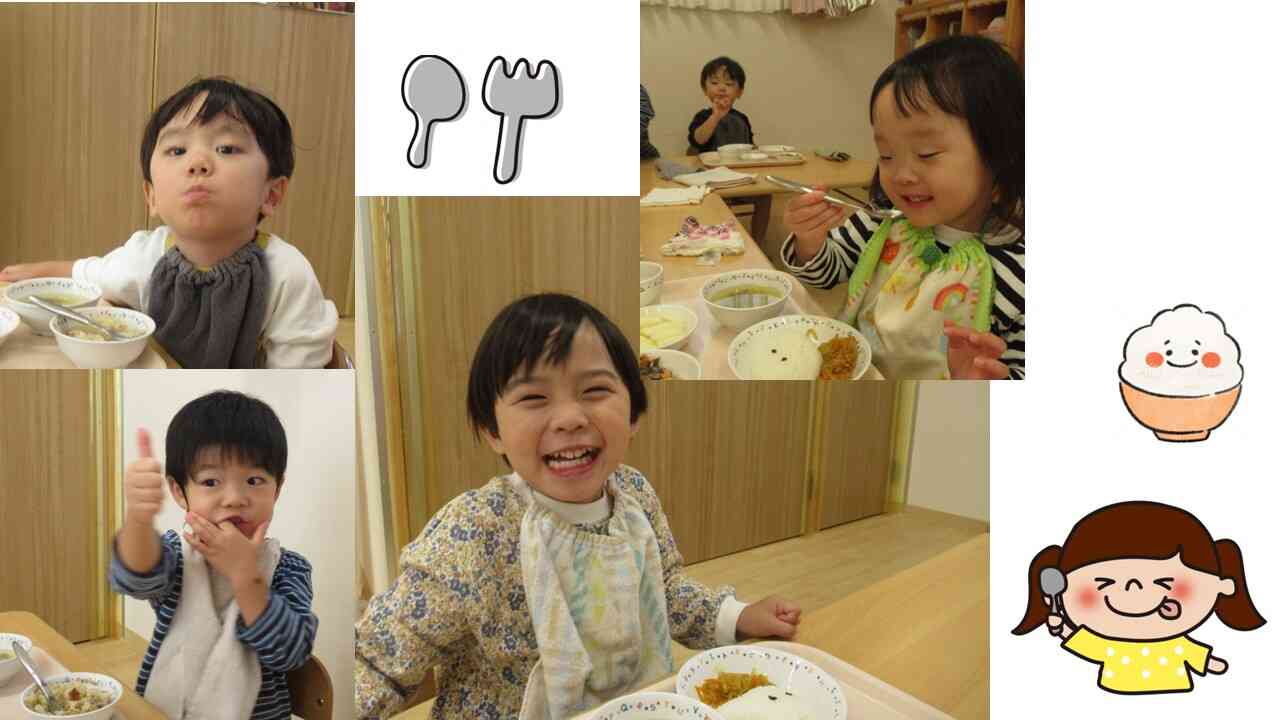 スプーンを使って上手に食べるうさぎ組さん。おかわりもたくさんして「筋肉つけるんだ~!」ともりもり食べます。