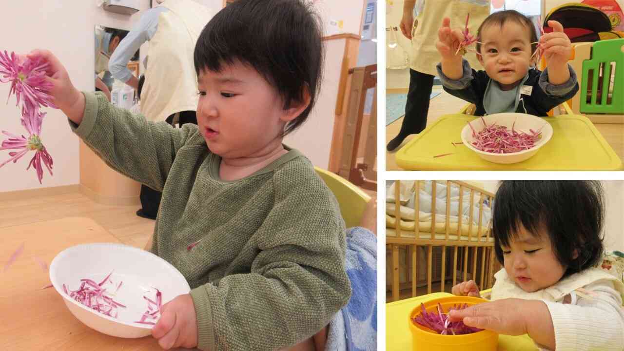 じっくりと触る子や上から花びらをぱらぱらと落としてみる子など、様々でした。