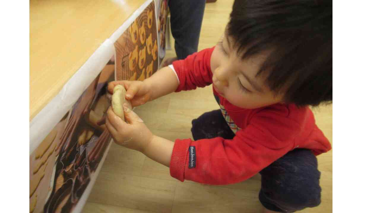 クッキーの生地に見立てた小麦粉粘土をどうやって作るのかみんなで見ました。
