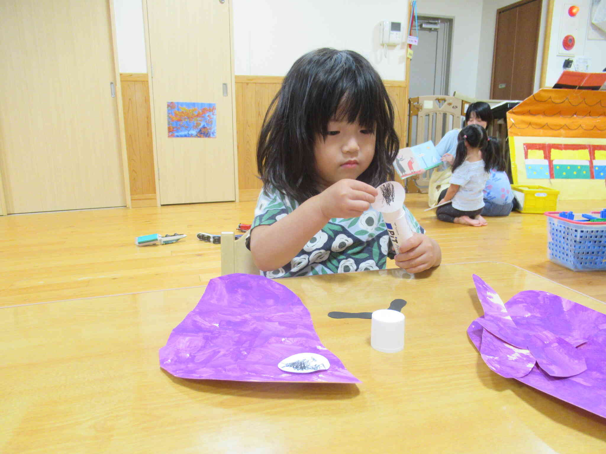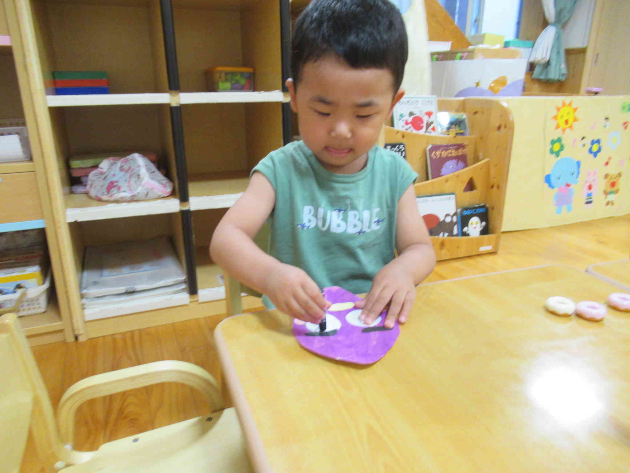 「コバトンがおいもほりしたいって!」と、作ったさつまいもを玄関の壁面に貼ってみました。