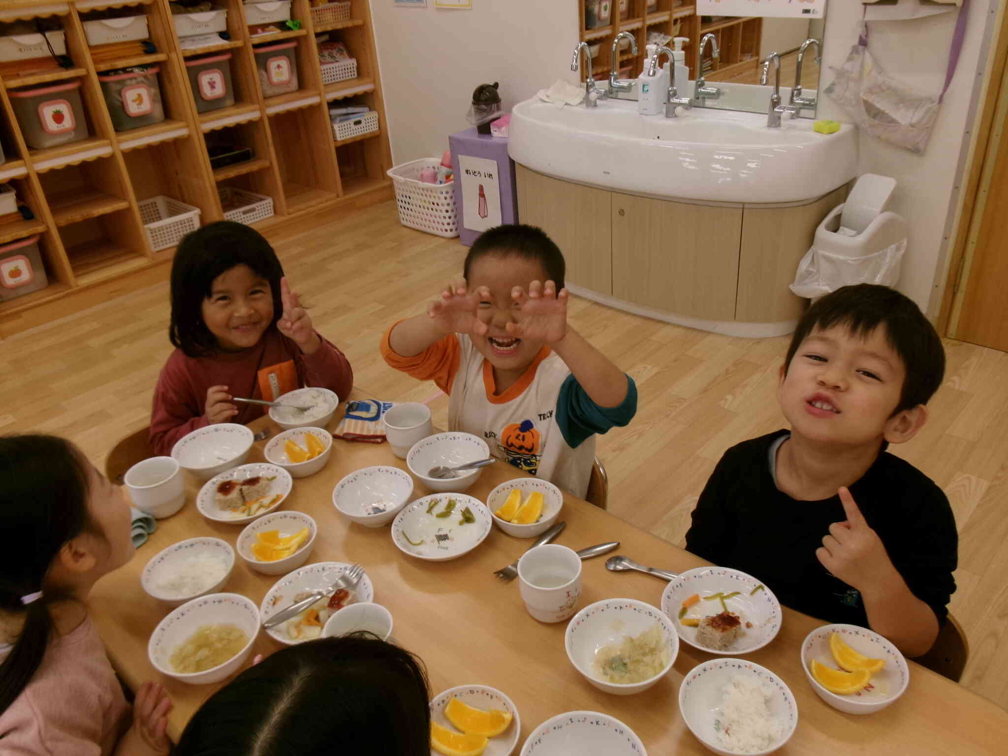 思わず「ピース!」美味しいね。みんなもりもり食べてます。