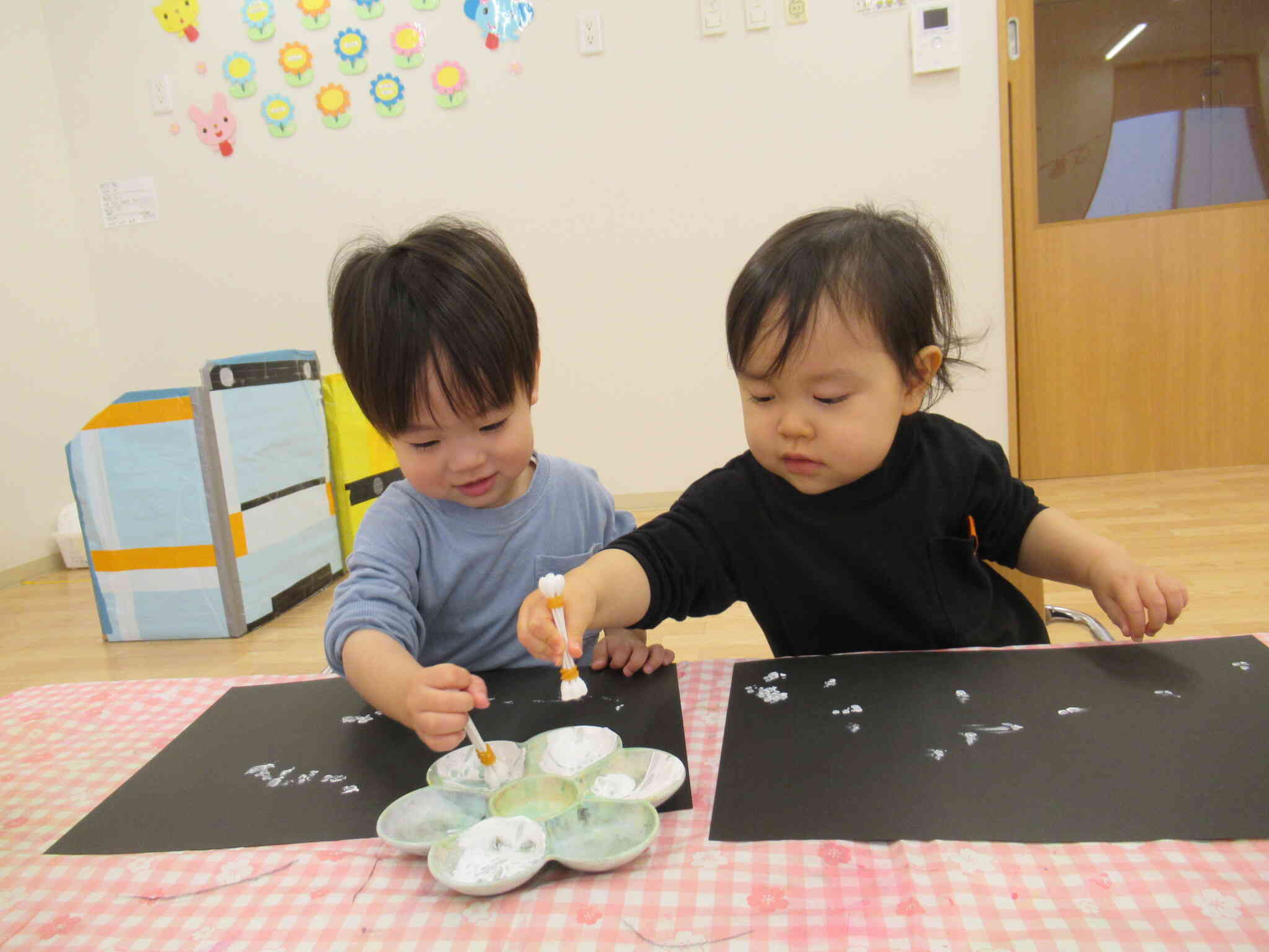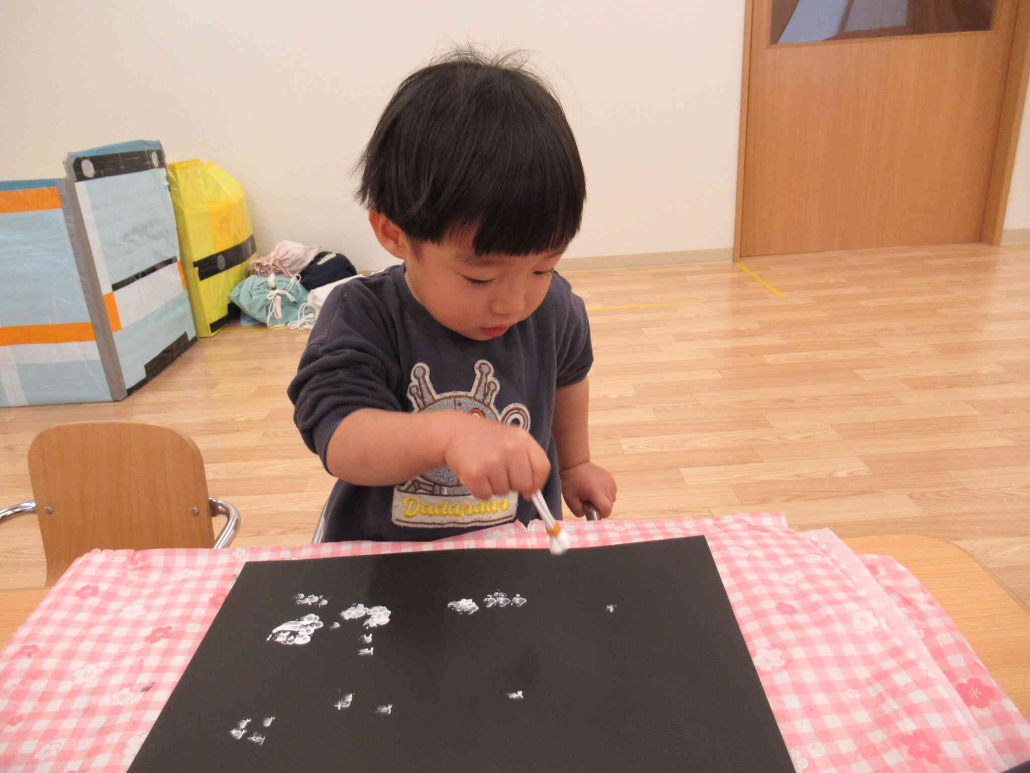 綿棒を束ねて、絵の具をつけて「雪」を降らせます。