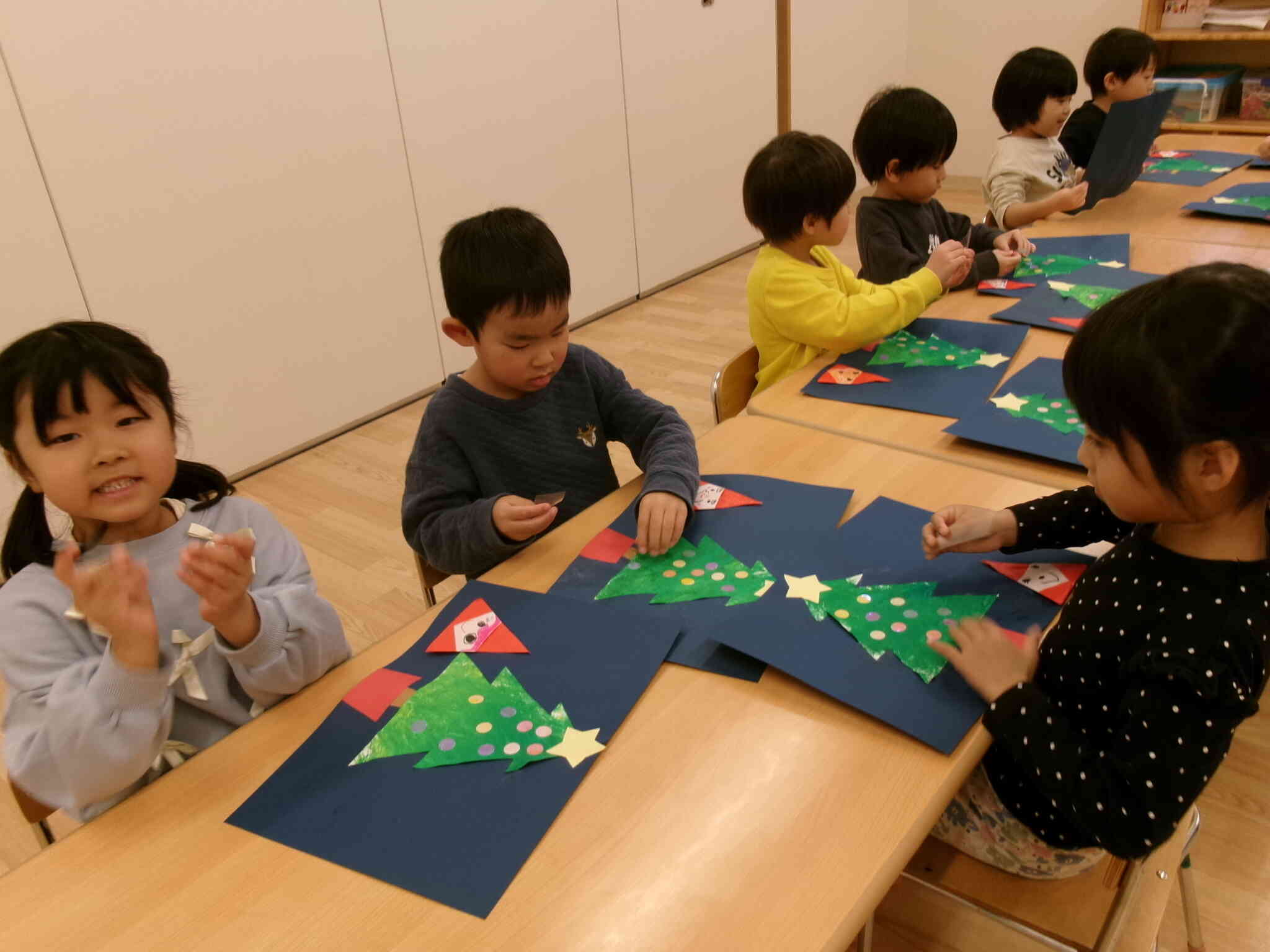 折り紙でサンタさんを折って、ツリーの飾りつけは「シール」