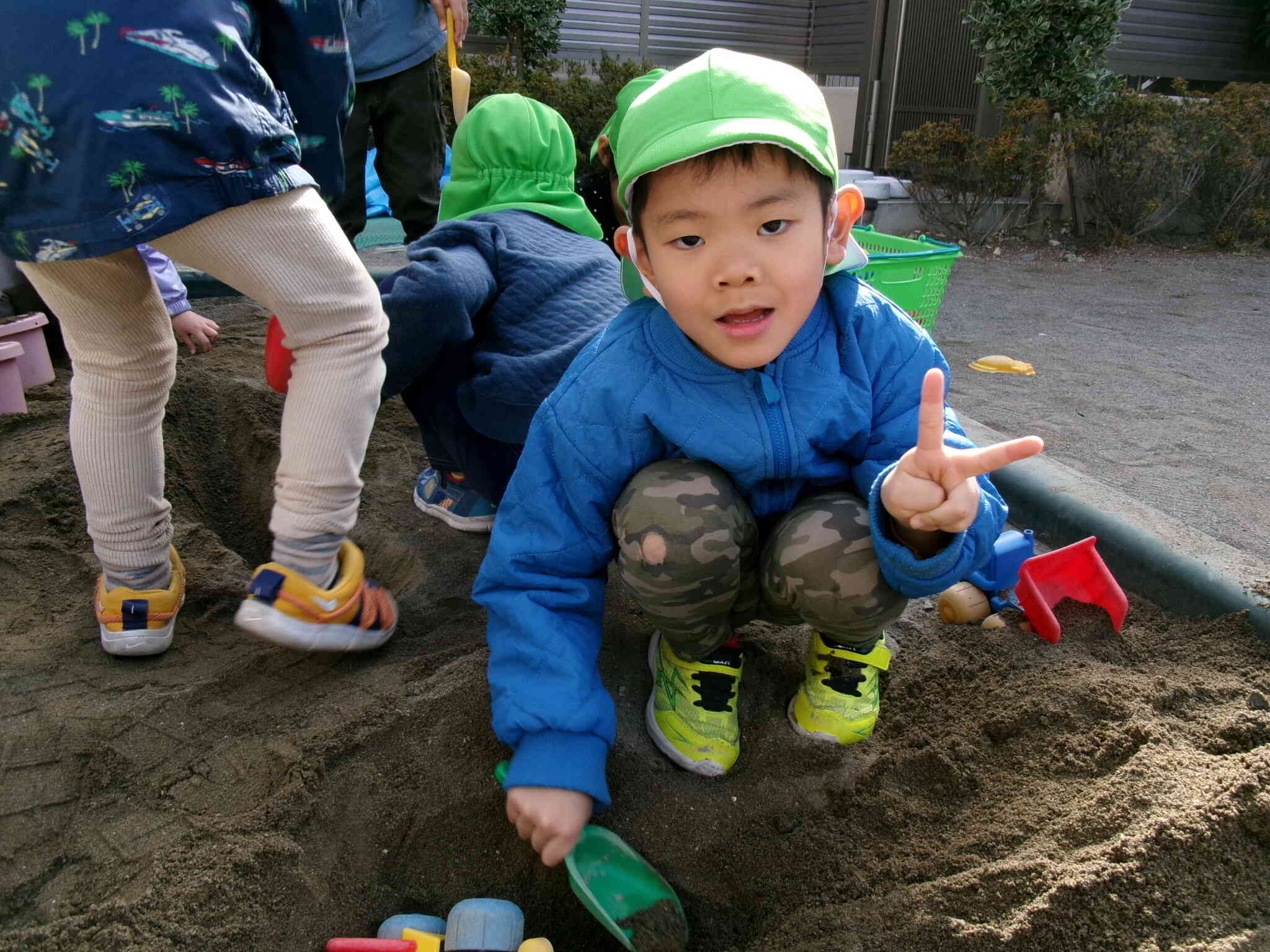 砂場で、お友達と一緒に「うんしょ・うんしょ」と、