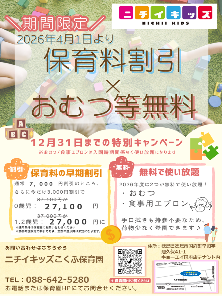 2026年度入園・継続特典!保育料の割引 & おむつ等の無償提供を開始します!