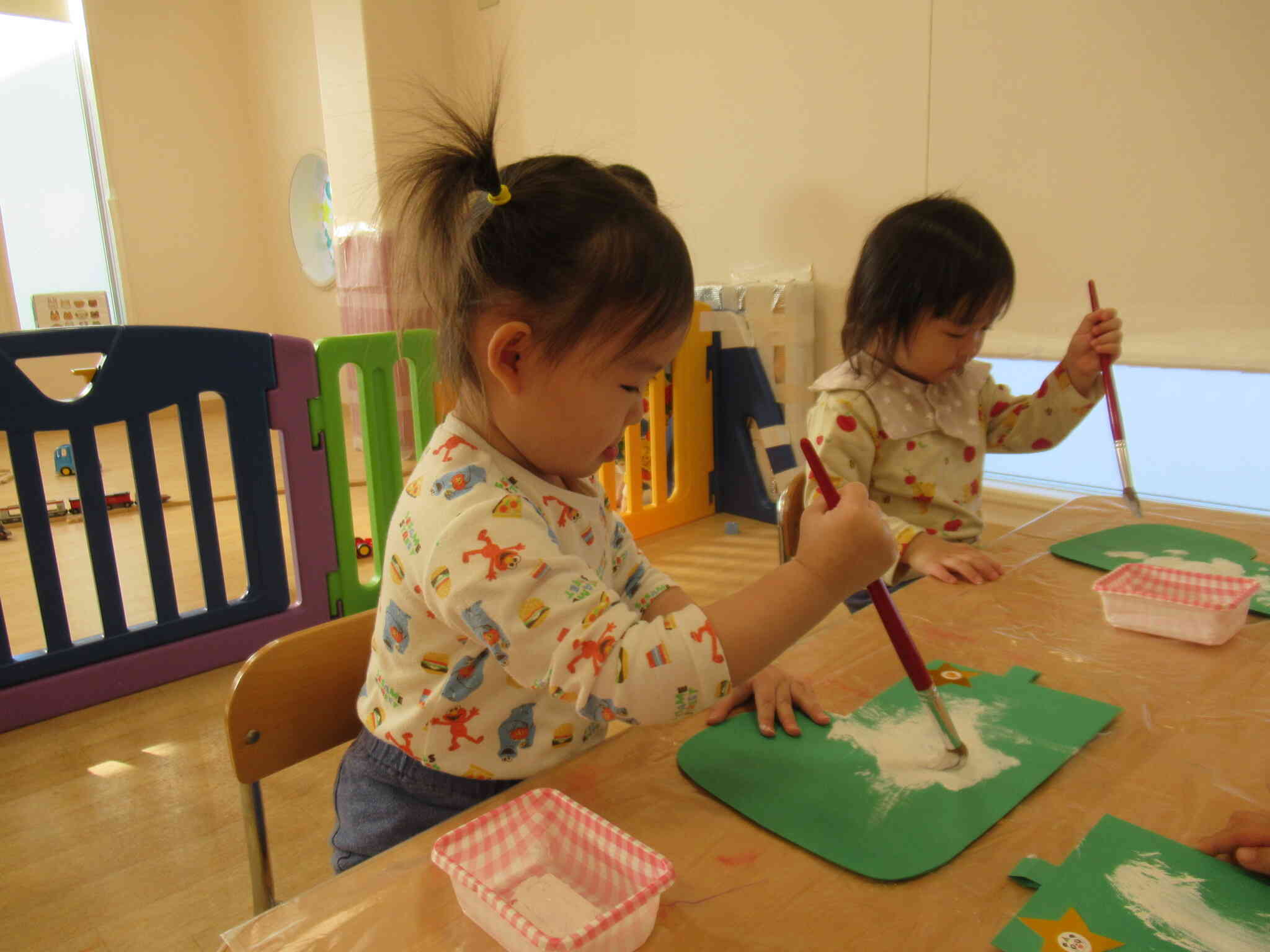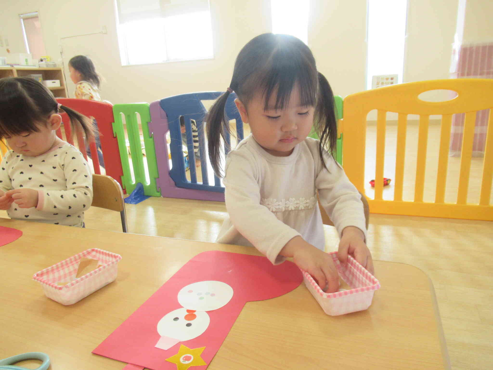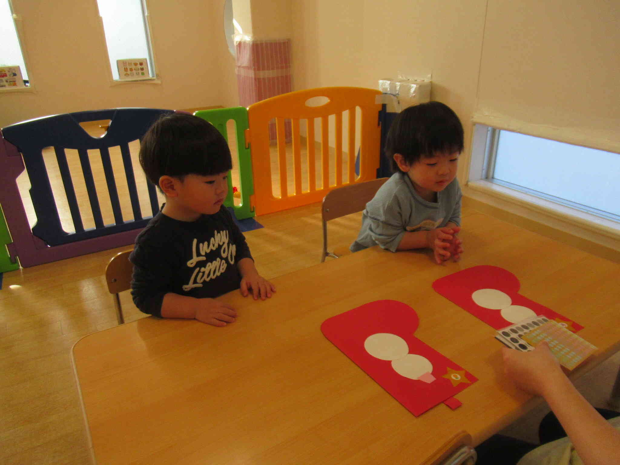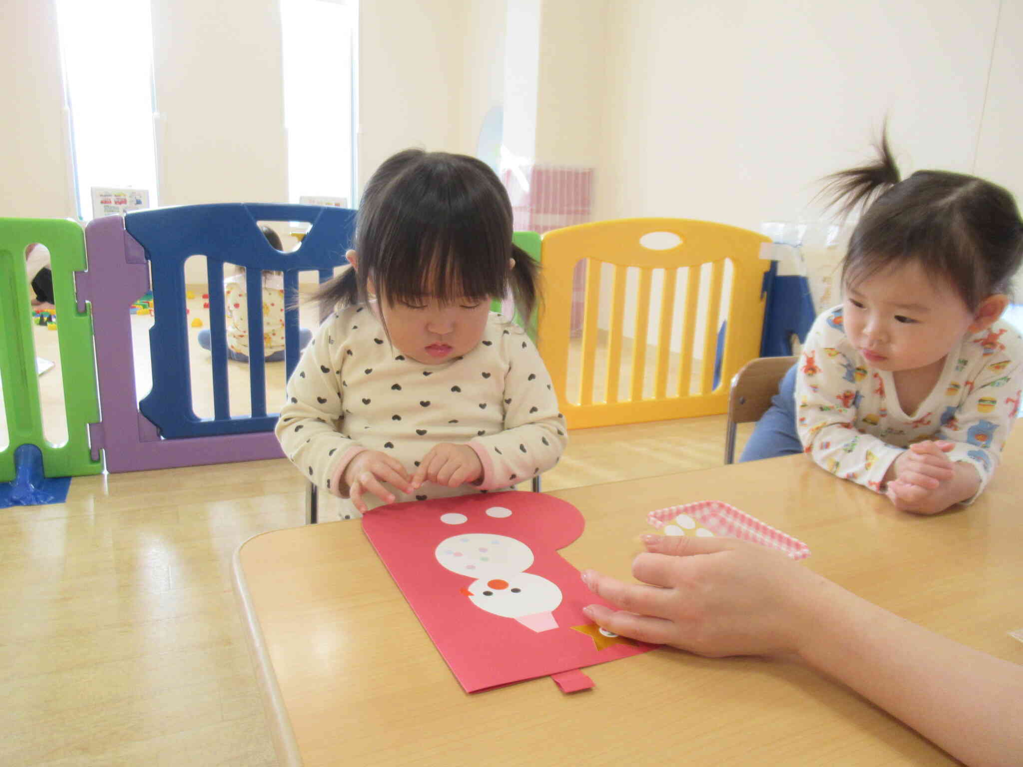小さなシールをぺったんぺったん♪小さな手の指先に意識を集中させて、みんなの表情は真剣でした。