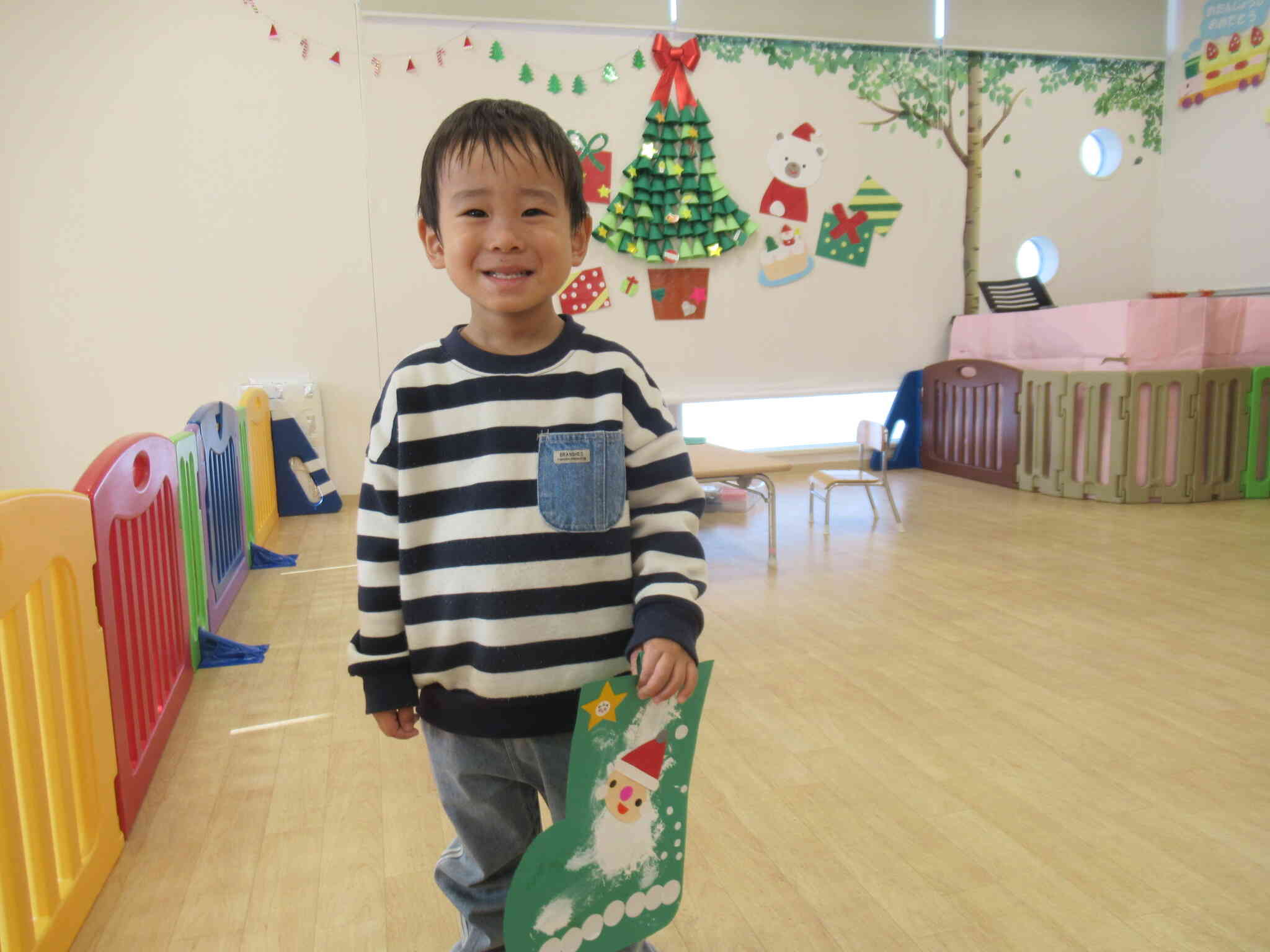 夢中で描いてくれましたよ。サンタさんの顔パーツを糊で貼って完成☆素敵なサンタブーツが出来上がりました。
