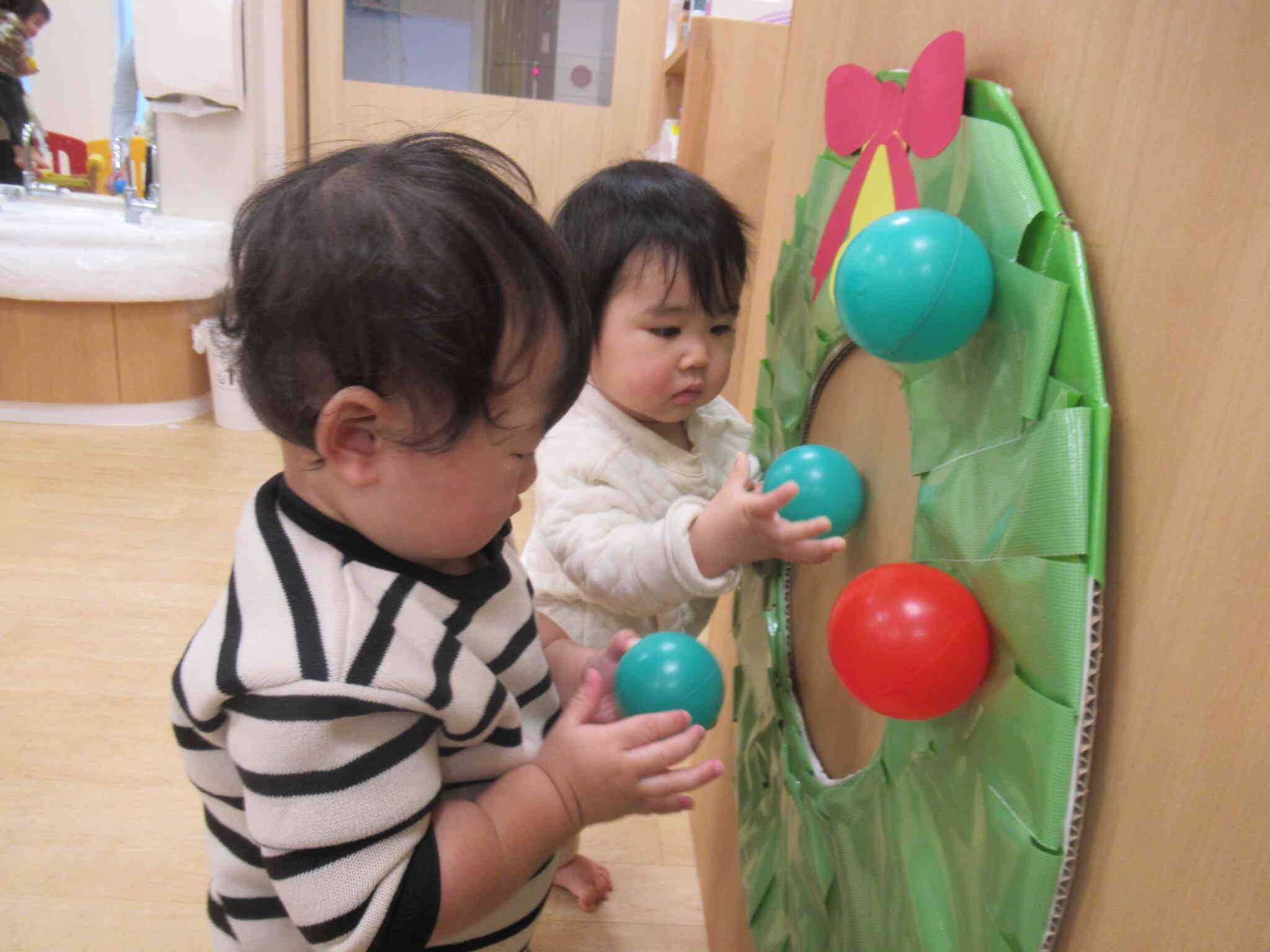 サンタさんから、カラーボールをもらって大きなツリーにぺったんこ。