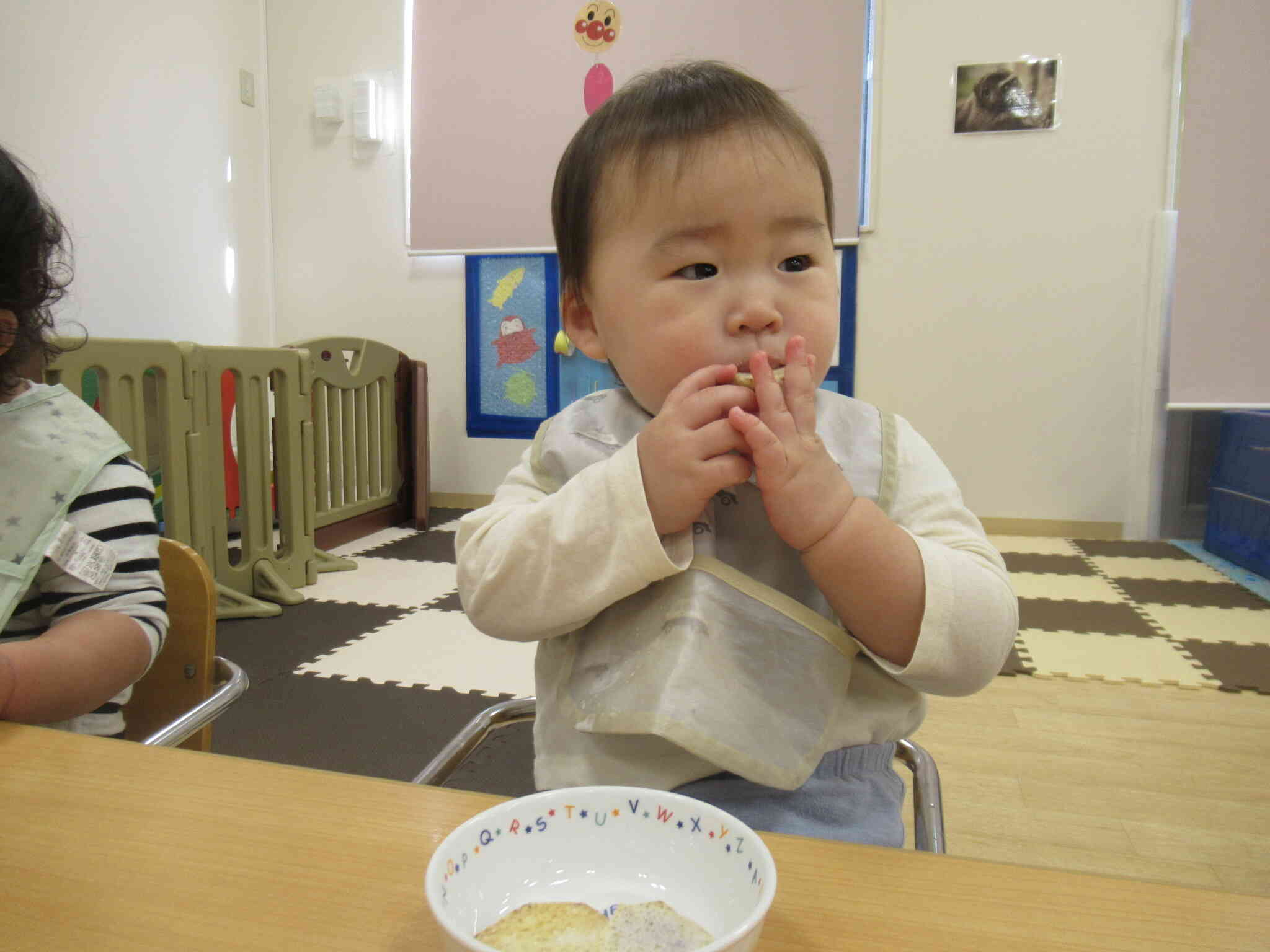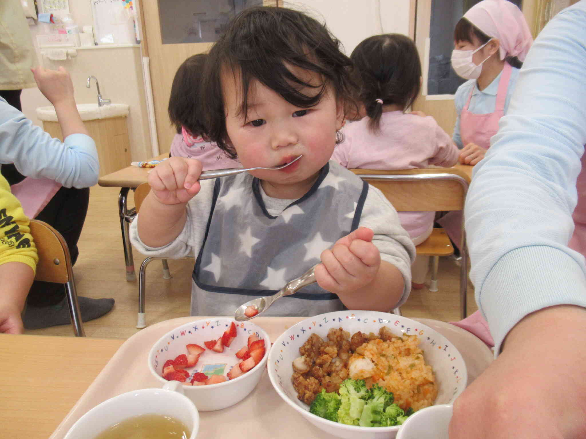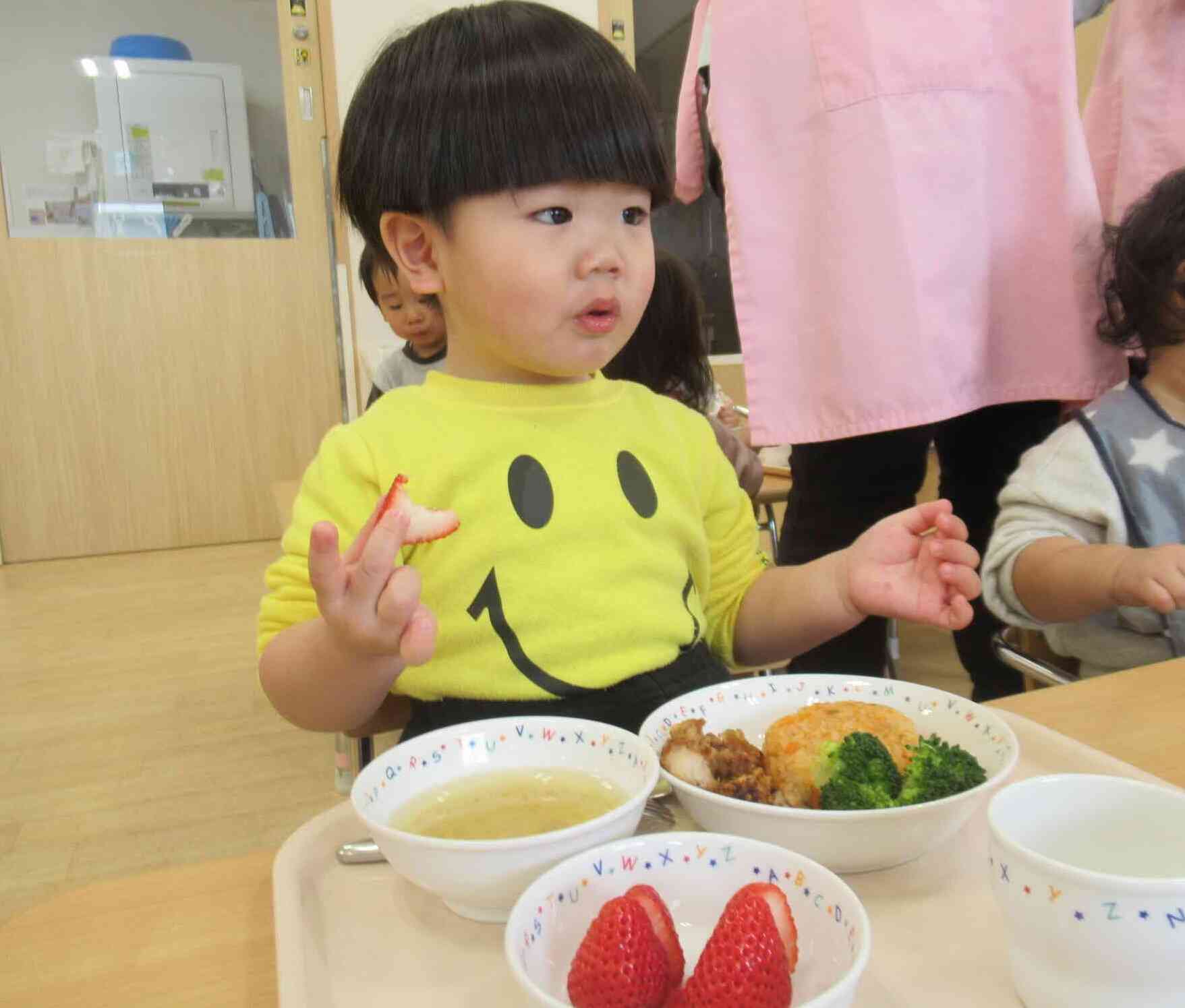 全クラスが同じお部屋で食べることで、いつもと違う雰囲気にワクワクしている様子♡
