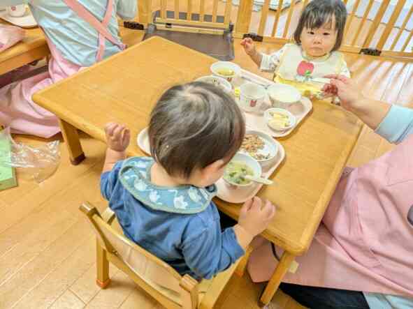 ひよこ組(0歳児)のお友だちも、先生に手伝ってもらいながら楽しく食べています。