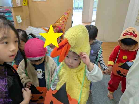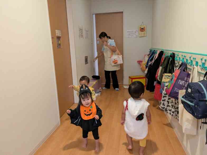ひよこ組(0歳児)のお友だちも先生と一緒によちよち歩きで園内を回り、ハロウィンの雰囲気を楽しみました。