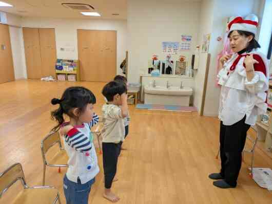 ぱんだ組(3歳児)のお友だちは、英語でのご挨拶を身振りを交えてしてみたり、クリスマスに因んだゲームを楽しみました!