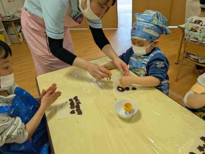バレンタインデーに因んで、幼児クラス(3.4.5歳)の食育でクッキー作りに取り組みました!