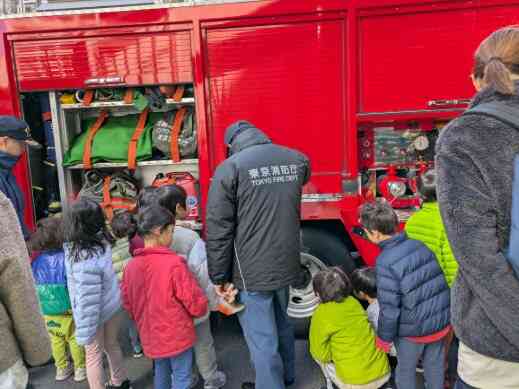 目の前で見るポンプ車にみんな大興奮。消防車についているいろいろな装備も教えていただき、とても喜んでいました!